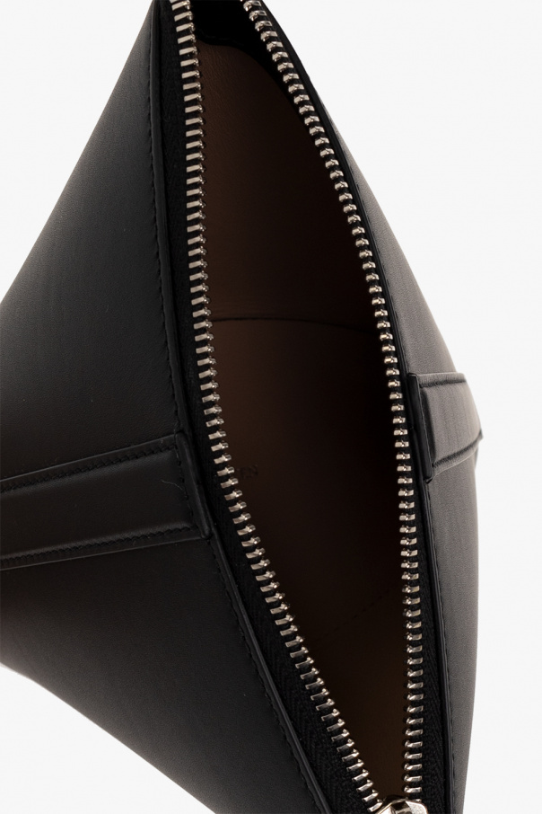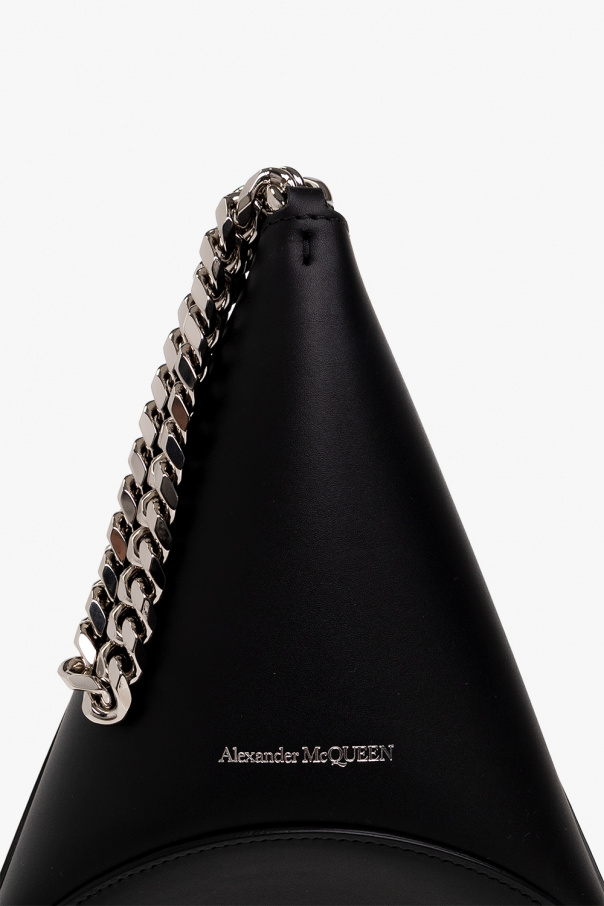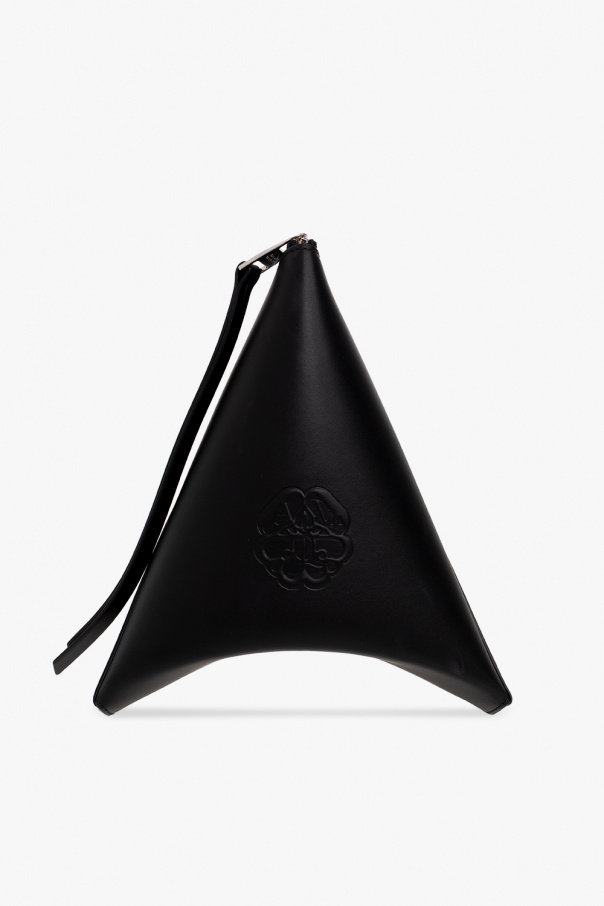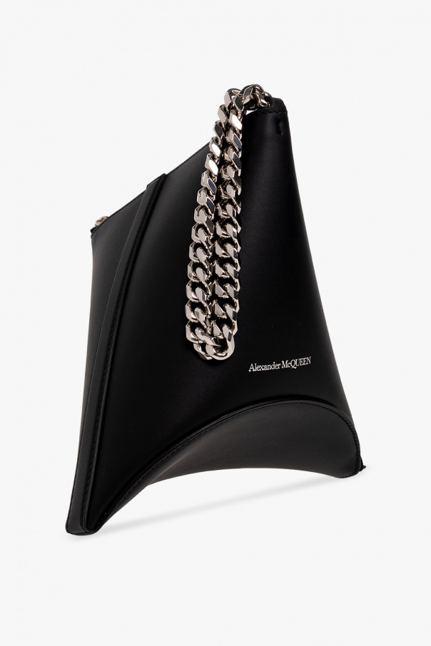 Black ‘The Curve Pouch’ handbag from Alexander McQueen. Crafted from calf leather, this model features a zip fastening, embossed ‘Seal’ motif on one side, silver-tone logo print on the other, wrist chain, one internal compartment and silver-tone metal hardware.
