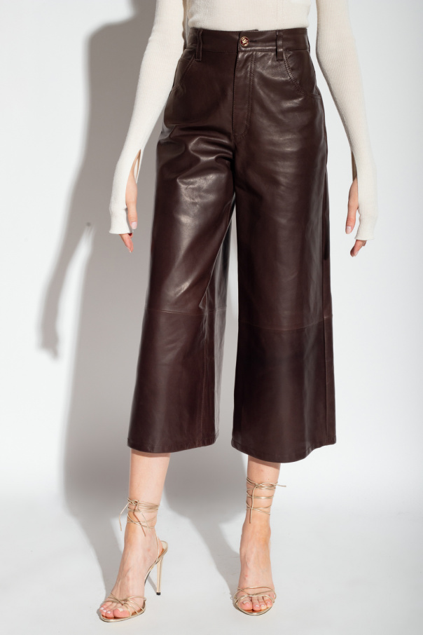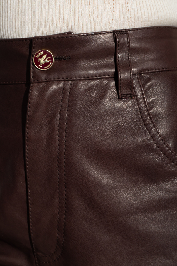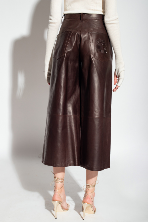 Dark brown culotte trousers from Etro. Made from lamb leather, this pair falls with flared legs and features a zip fly with a distinctive Pegaso button, four slip pockets and an embossed Etro Cube logo at the back.