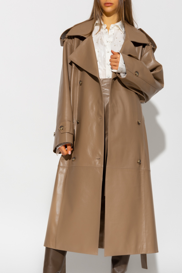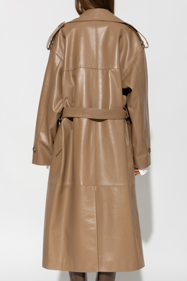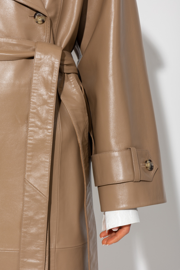 Brown ‘Amman’ coat from The Mannei. Made of lamb leather, this model features button fastenings, tie belt, epaulettes with buttons on the shoulders, notch lapels, two flap pockets, single rear vent and long sleeves with button cuffs.