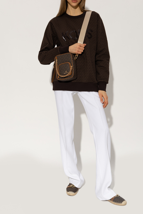Brown ‘Rory’ espadrilles from Michael Michael Kors. Crafted from faux leather, this model sits on a brown and cream rubber sole and showcases gold-tone logo hardware on the front.