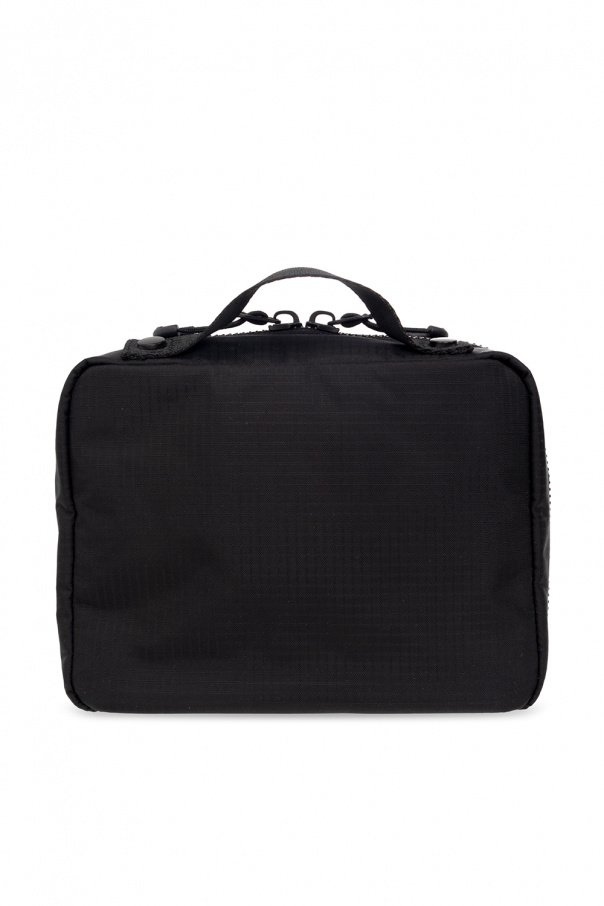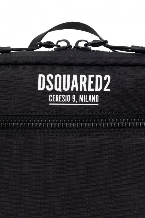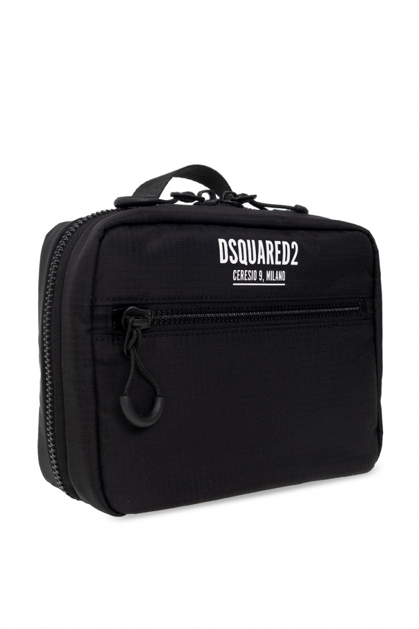 Black 'Ceresio 9’ pouch from Dsquared2. Crafted from lightweight, waterproof Ripstop fabric, this design secures with a two-way zip and features a white logo print and a zip pocket on the front, a top handle and two zip pockets and one slip pocket inside.