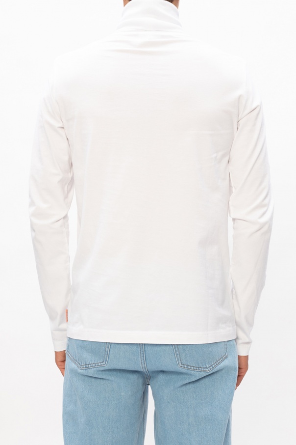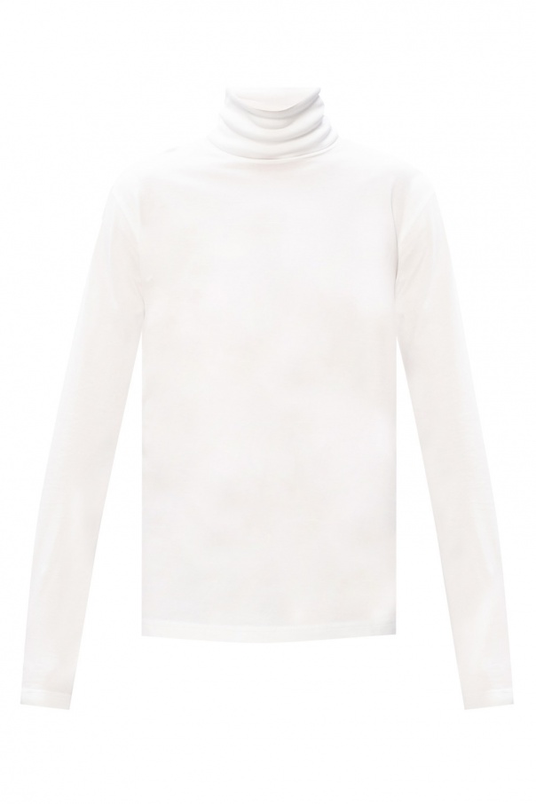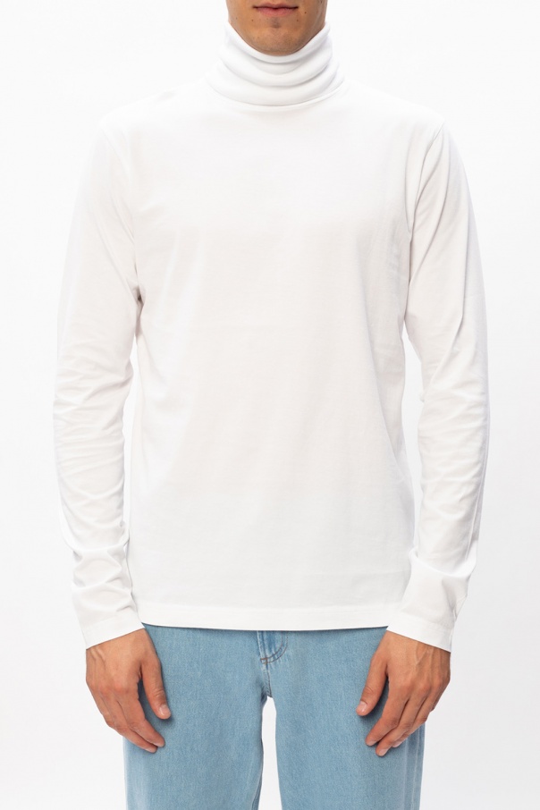White turtleneck sweater from Acne Studios. Crafted from cotton, this item comes enriched with a pink and black logo patch.