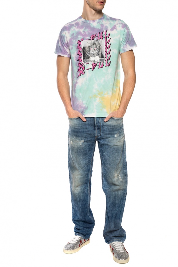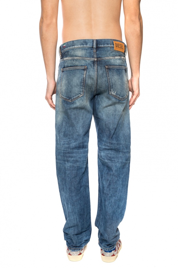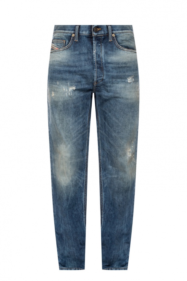 Blue ‘D-Macs’ distressed jeans from Diesel. Fastened with buttons. Two slip pockets on the front, two at the back. Straight legs.