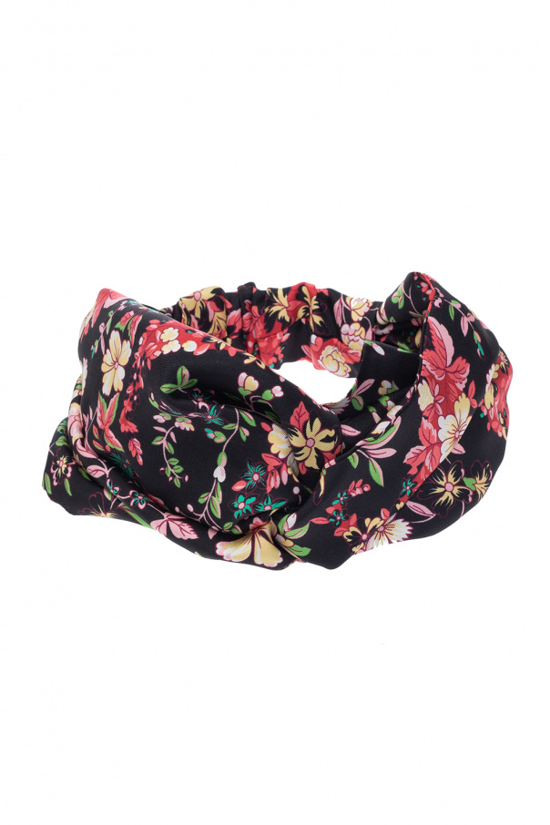 Black headband from Etro. Crafted from silk satin, this item showcases a colourful floral pattern, a decorative knot on the front and an elastic trim at the back.