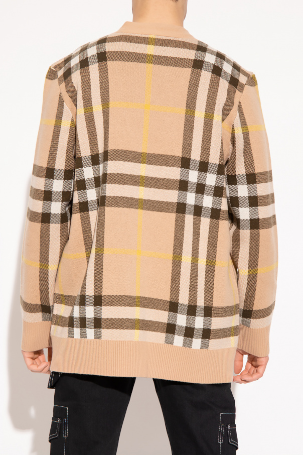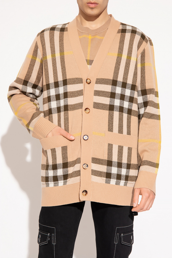 Beige ‘Wilmore’ cardigan from Burberry. Crafted from a wool and cashmere blend, this garment features button fastenings, white, yellow and dark green check pattern, two front pockets and ribbed trims at the hem and cuffs.