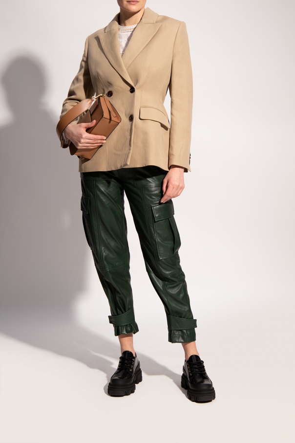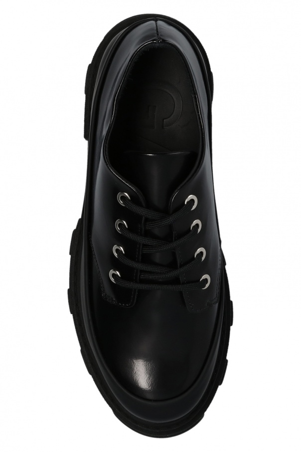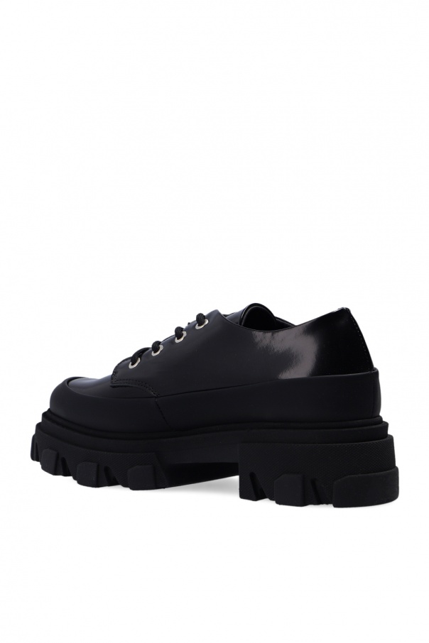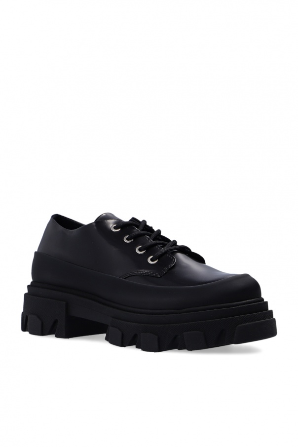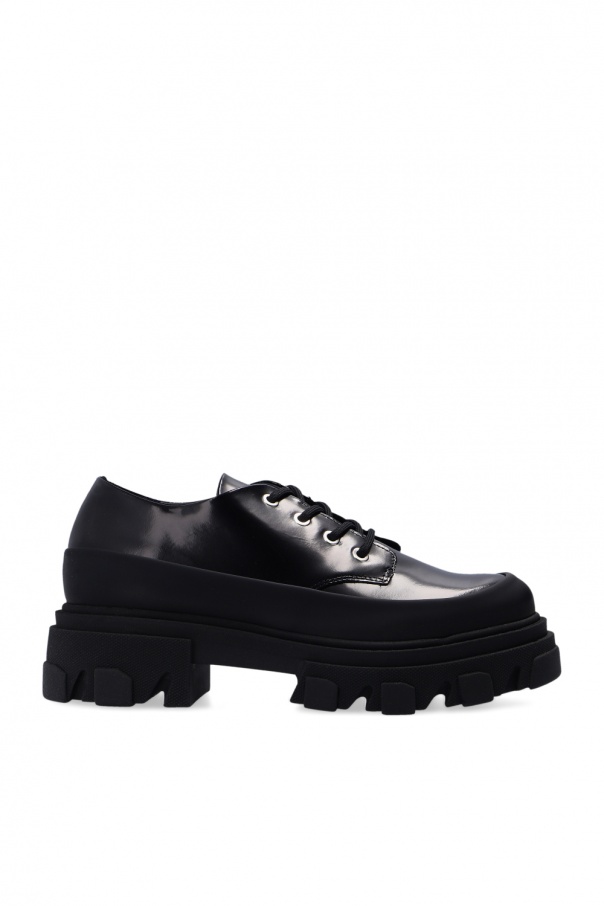 Black platform boots from Ganni. Crafted from a patent calf leather, this lace-up design features a black rubber sole and silver-tone metal hardware.