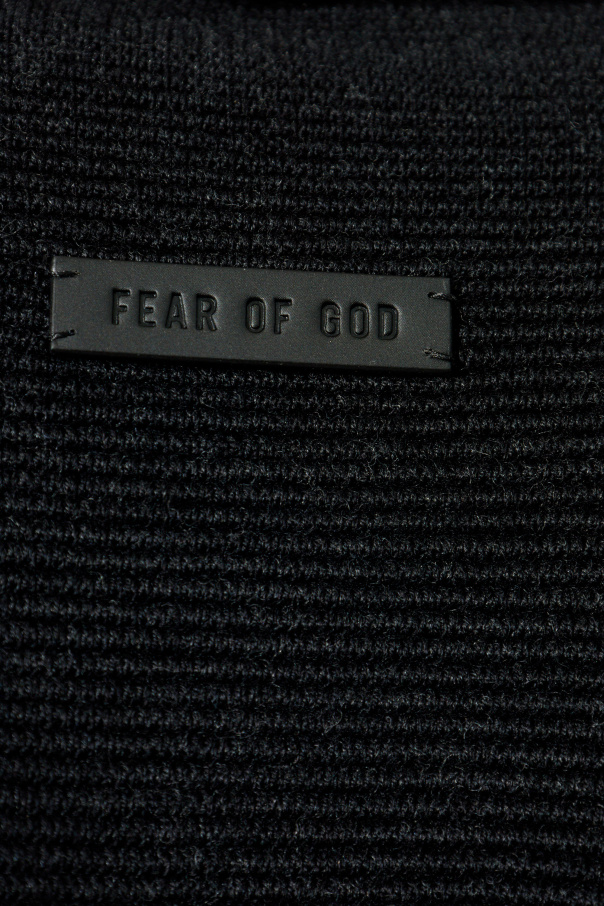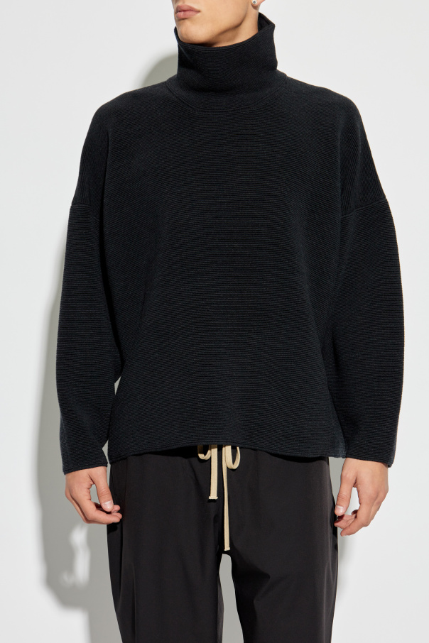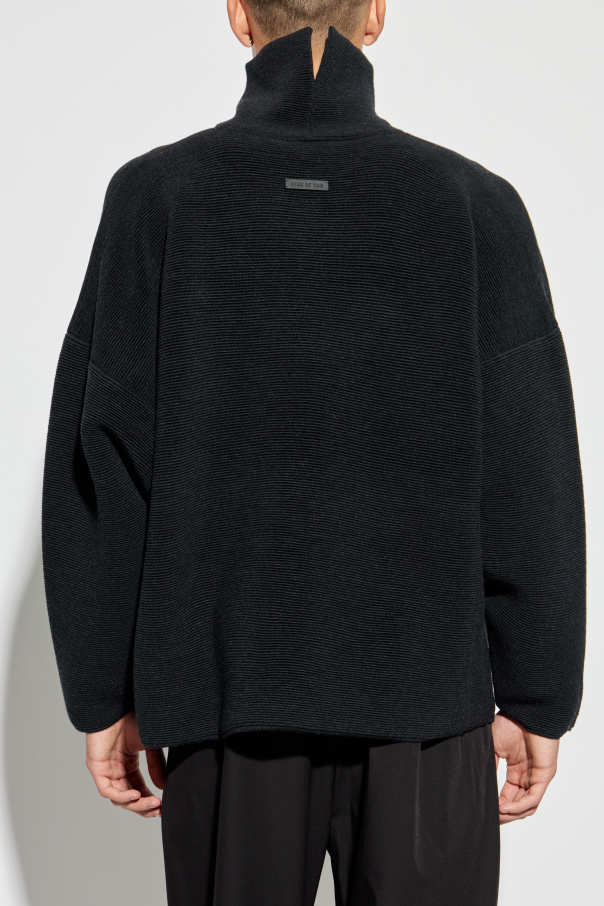 The exquisite Ottoman Wool Turtleneck by the illustrious Fear of God is a quintessential piece for the discerning gentleman. Crafted from premium virgin wool, this sophisticated sweater epitomizes luxury and warmth, making it an ideal choice for cooler days. This black turtleneck features a relaxed fit with wide sleeves, accentuated by a delicate horizontal ribbing pattern throughout the fabric. The high turtleneck collar not only enhances its elegant silhouette but also provides additional warmth. An understated black patch bearing the "FEAR OF GOD" insignia is discreetly placed on the back, just below the collar, signifying the garment's prestigious origin. This versatile piece is showcased alongside a long beige coat, black trousers with a beige drawstring, and white shoes, highlighting its adaptability to various styles and colors. Why Buy This Product? Luxuriously crafted from 100% virgin wool Elegant horizontal ribbing and relaxed fit High collar for added warmth and style Subtle branding by the renowned Fear of God Versatile design suitable for multiple outfits