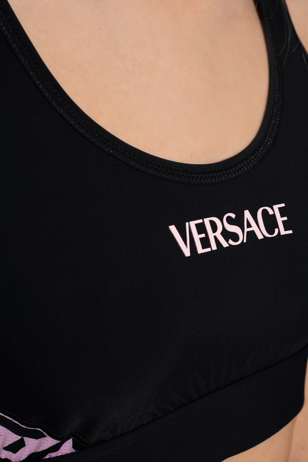 Black and light pink sleeveless crop top with a round neck, logo print and La Greca pattern from Versace.