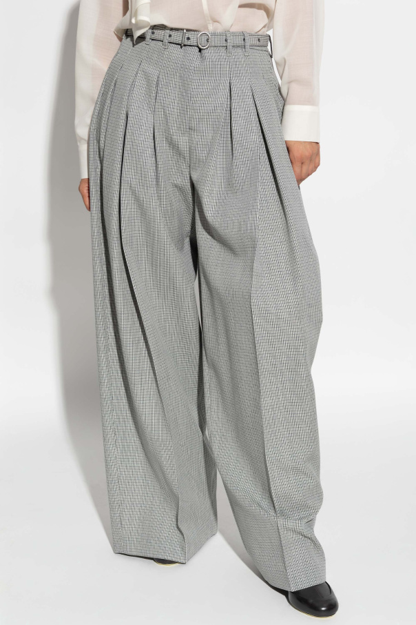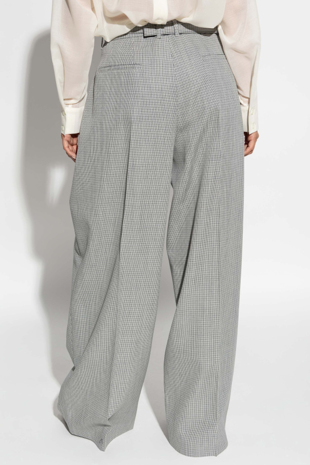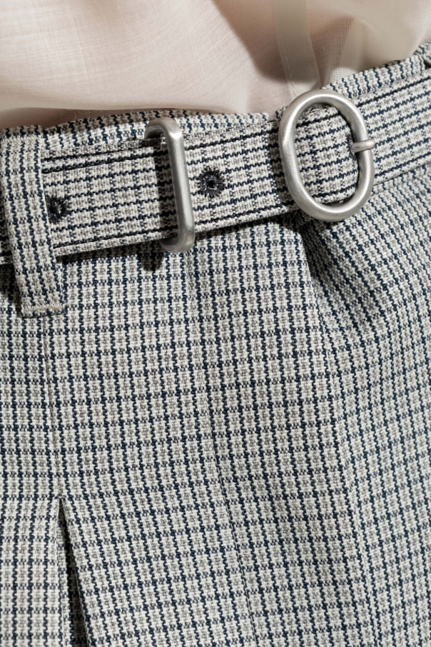 Introducing the JIL SANDER Plaid Patterned Trousers, an exquisite addition to your wardrobe from our exclusive collection. These pants epitomize sophistication and comfort, making them a versatile piece for any occasion. Crafted from luxurious 100% wool, these trousers feature a subtle plaid pattern in shades of gray, white, and black, adding a touch of class and elegance to your ensemble. The wide-leg silhouette and high waist, accentuated by a silver-buckled belt, create a flattering and stylish look, while the front pleats add structure and volume. Details such as the back pockets enhance practicality, while the zip and hook fastening ensure a secure fit. With their dominant gray hue, these trousers are effortlessly chic, easily pairing with a variety of tops and accessories. Why Choose This Product? Exquisite 100% wool fabric for unparalleled comfort and quality. Stylish plaid pattern in sophisticated shades. Wide-leg silhouette and high waist for a flattering fit. Functional and decorative silver-buckled belt. Practical back pockets and secure zip and hook fastening. Versatile gray color that complements any wardrobe.