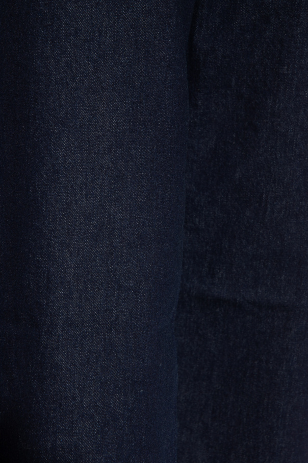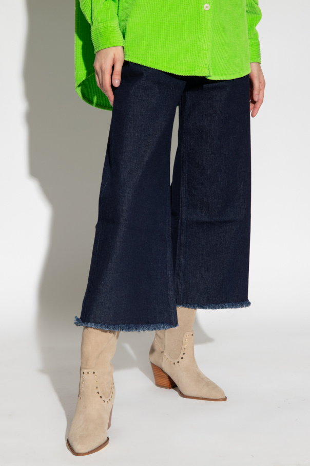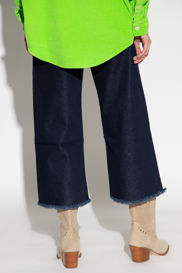 Navy blue ‘Lotus’ jeans from Wandler. Falling with wide cropped legs, this pair features a high-rise waist, a zip fly with a button, classic five pockets and frayed cuffs.