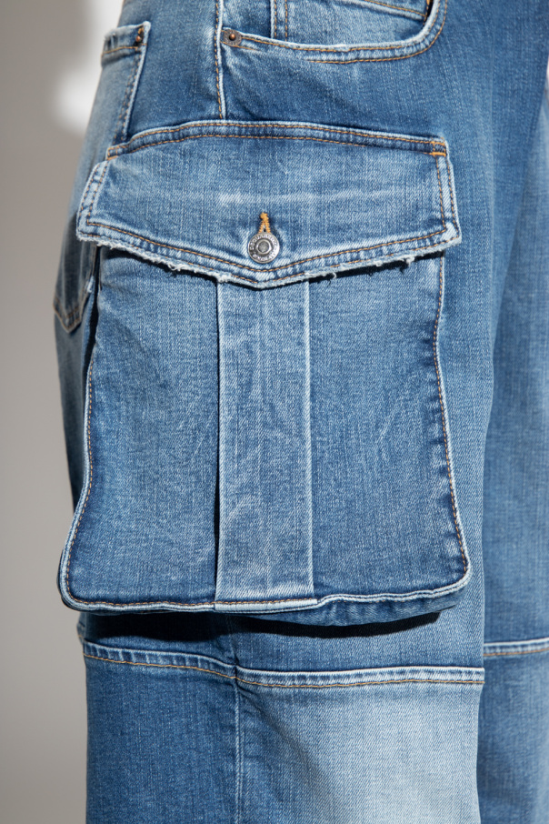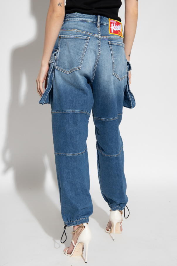 Blue jeans from Dsquared2. Made of cotton, this pair features button fastenings, worn effect, red, yellow and white logo patch, five slip pockets, two buttoned pockets and drawstring cuffs.