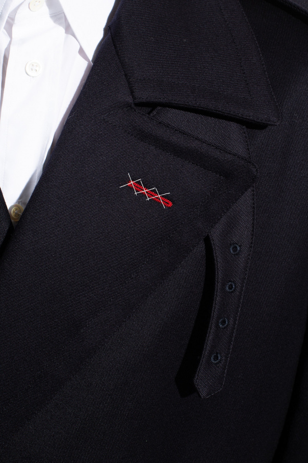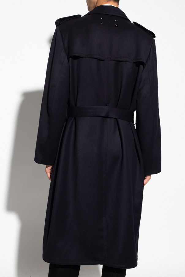Navy blue trench coat from Maison Margiela. Crafted from wool with a double-breasted silhouette, this style features notch lapels, epaulettes on the shoulders, two slip pockets, graphic embroideries with the brand's logo on the front and back, a buckle belt at the waist and a single rear vent.