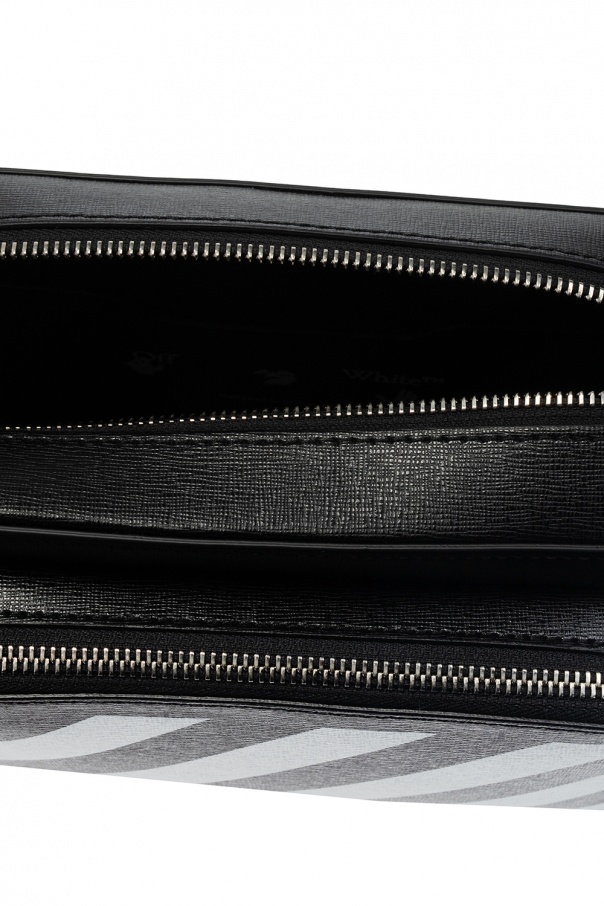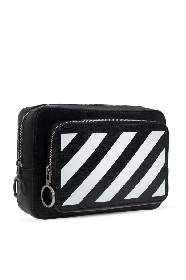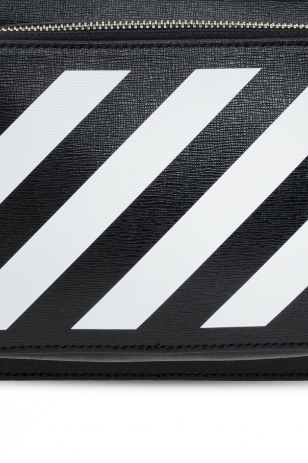 Black belt bag from Off-White. Crafted from textured leather, this design features a zip fastening, white logo print, yellow adjustable belt and an embroidered logo pattern in black, front zip pocket and one internal compartment with one card slot.
