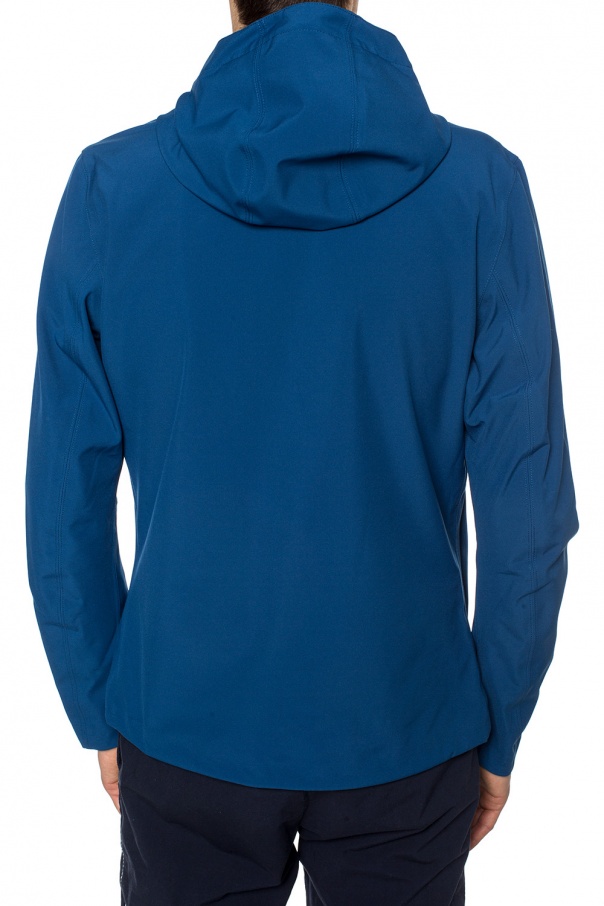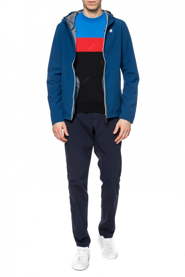 Blue 'Jack Bonded Jersey' hooded jacket from K-Way. Features two-way zip closure with white-yellow-orange taping, white-green logo patch and 2 zip pockets on the front as well as drawstrings at the hem and grey coating inside.