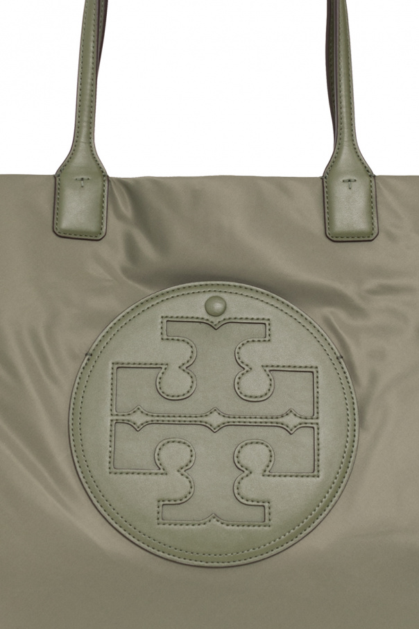 Khaki ‘Ella’ shopper bag from Tory Burch. Crafted from recycled materials, this design secures with a magnetic fastener and features a snap-fastened pocket with a logo on the front, two half-round straps and one zip pocket and one slip pocket inside.