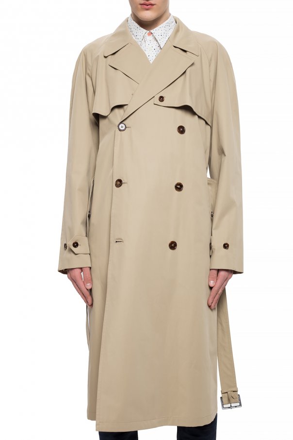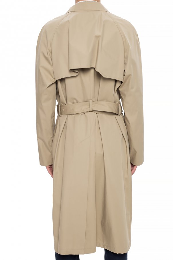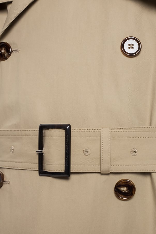 Beige coat from Dolce & Gabbana. Made of cotton. Fastened with buttons, tie fastening at the waist. Two flap pockets fastened with buttons on the front. Comes with a buckle belt made of fabric.