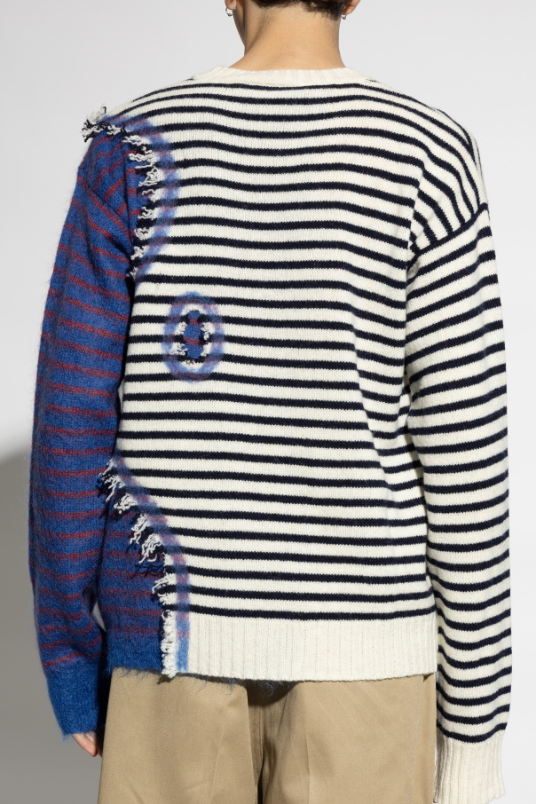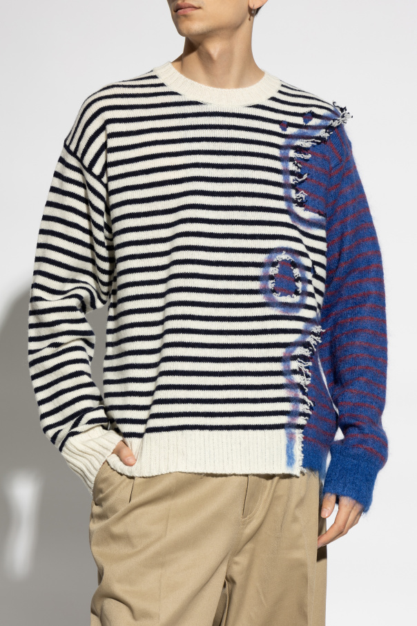 Introducing a masterpiece of textile artistry, the Marni Vintage Stripe Sweater. Crafted with the utmost precision, this garment is a testament to the high-quality materials and craftsmanship synonymous with exclusive fashion brands. The sweater is woven from 100% pure wool, ensuring both comfort and durability. The design features a vibrant array of stripes in navy and white, accented with deliberate distressing and tearing on the left side, intricately stitched in blue to highlight these unique details. Splashes of blue and red stains artfully placed on the sleeve and near the tears further accentuate the sweater's vintage appeal. Its long sleeves and round neckline are complemented by white ribbed cuffs and hem, adding a classic finish to this eclectic piece. With no visible fastening, this pullover sweater is designed for ease of wear, effortlessly sliding over the head to envelop the wearer in soft, sumptuous wool. The vintage aesthetic is not merely a style but a narrative woven into the very fabric of the sweater, making each piece uniquely captivating. Why Purchase This Product? Expert craftsmanship and high-quality 100% wool material. Unique distressing and coloration details for an authentic vintage look. Exquisite attention to detail, indicative of the Marni brand's luxury status. Versatile design that pairs well with both casual and sophisticated attire.