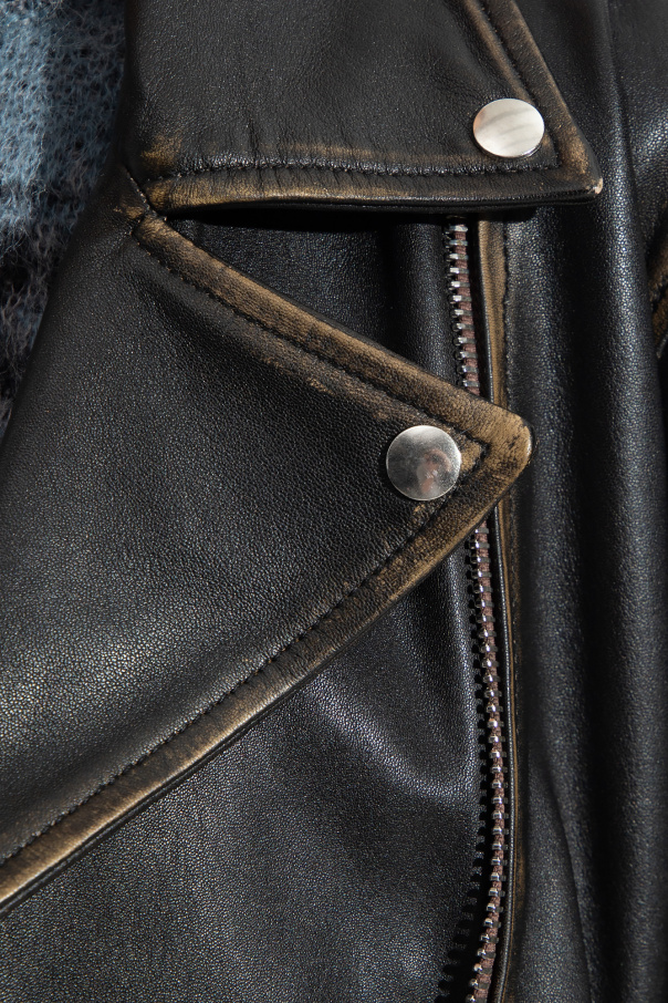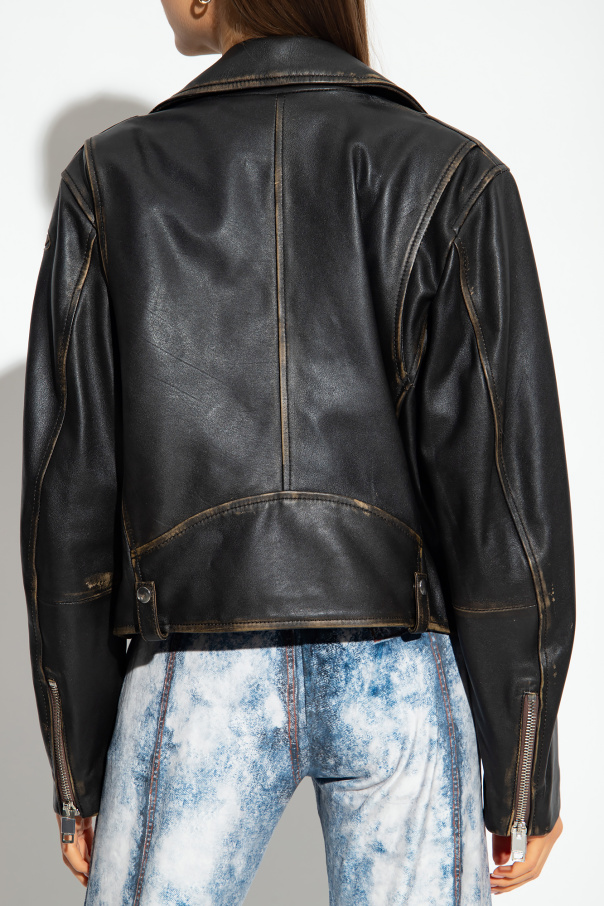 Black ‘L-EDME’ distressed jacket from Diesel. Made of lamb leather, this garment features a zip fastening, logo on the shoulder, collar, three pockets, long sleeves with zip details and snap-fastened tabs at the waist.