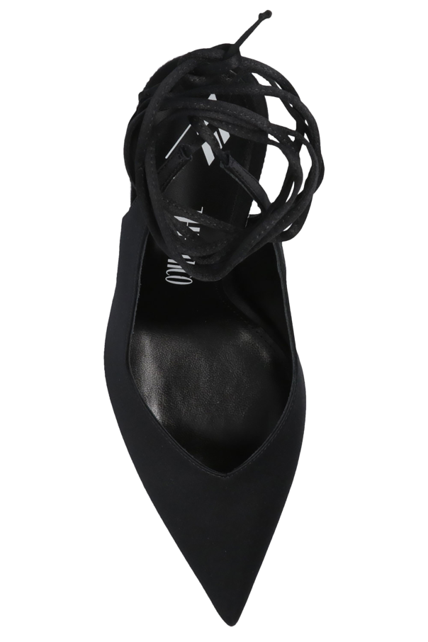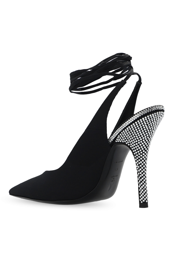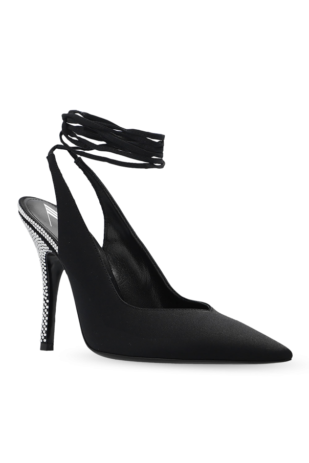 Black ‘Venus’ pumps from The Attico. Made of satin, this model features a pointed toe silhouette, long ankle drawcords, a black leather sole and a heel entirely clad in glossy crystals.