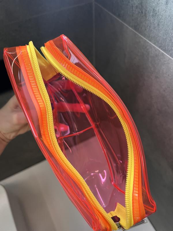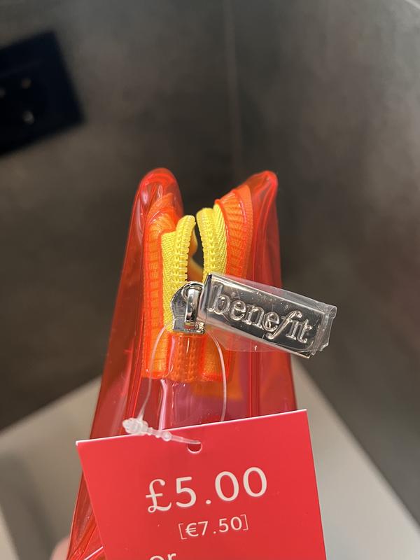 Полупрозрачная косметичка Benefit с желтой молнией.