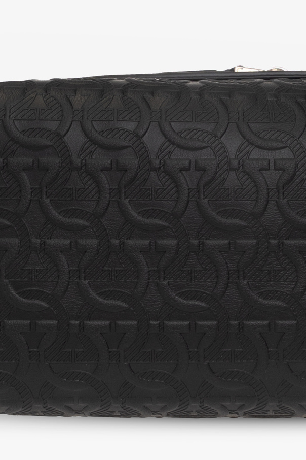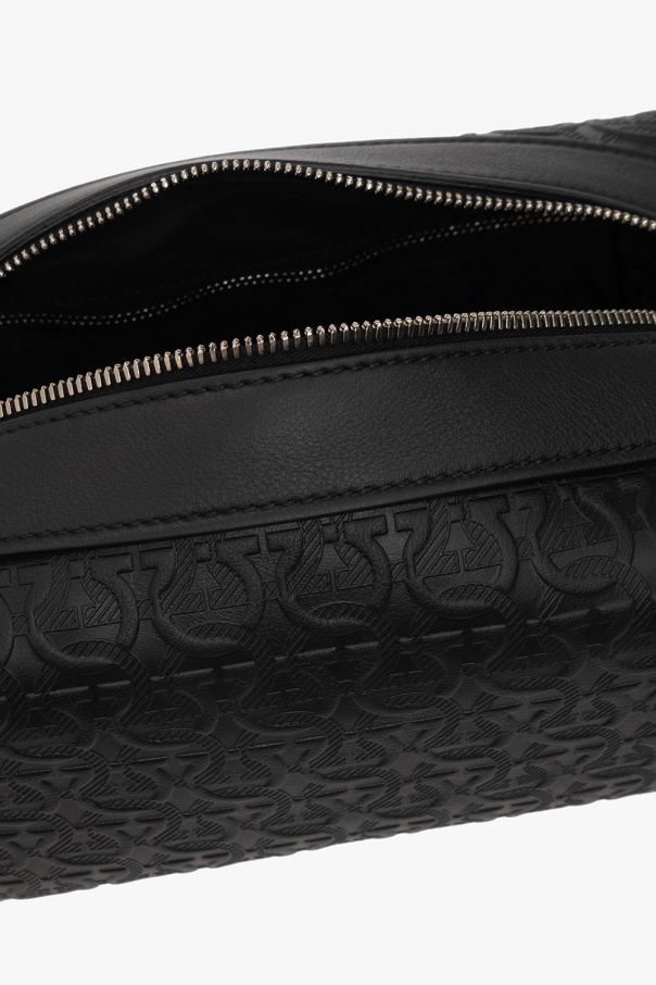 Black wash bag from FERRAGAMO. Crafted from calf leather, this item fastens with a two-way zipper and showcases a tactile monogram pattern, a side handle, silver-tone metal elements and one internal compartment with one zip pocket.