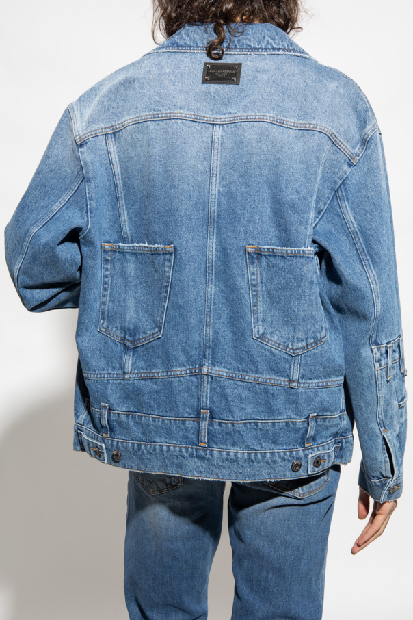 Blue denim jacket with multiple pockets from Dolce & Gabbana. Fastened with buttons, this design is enriched by distressed details and logo patches.