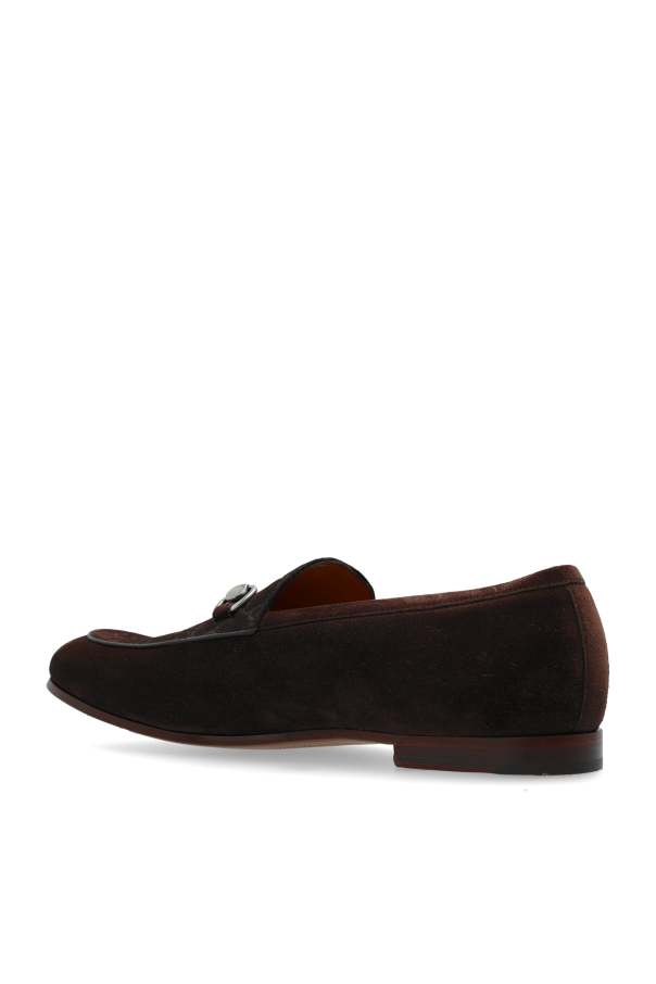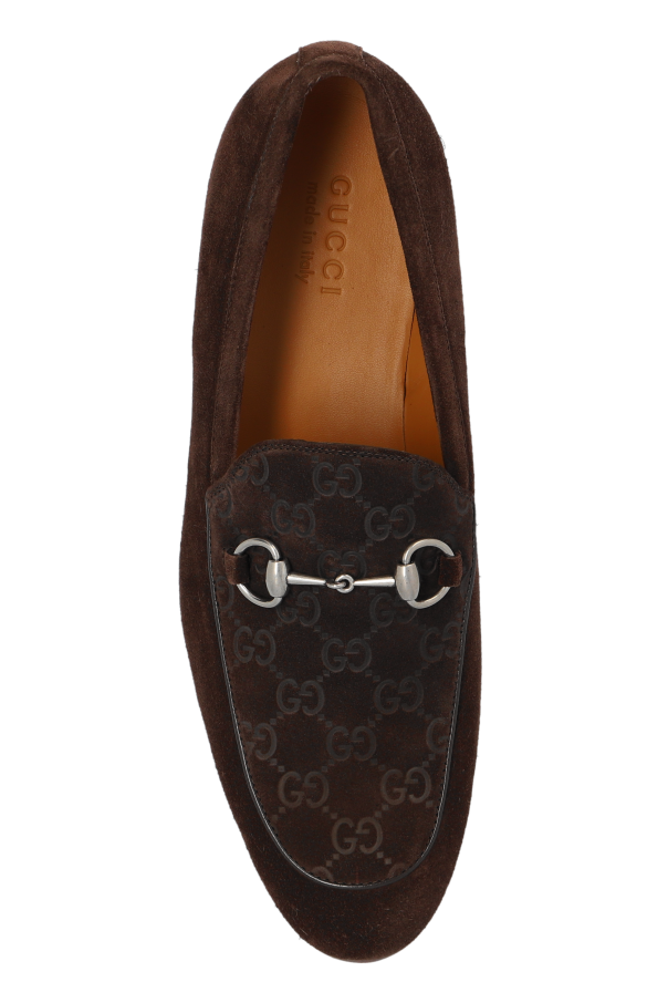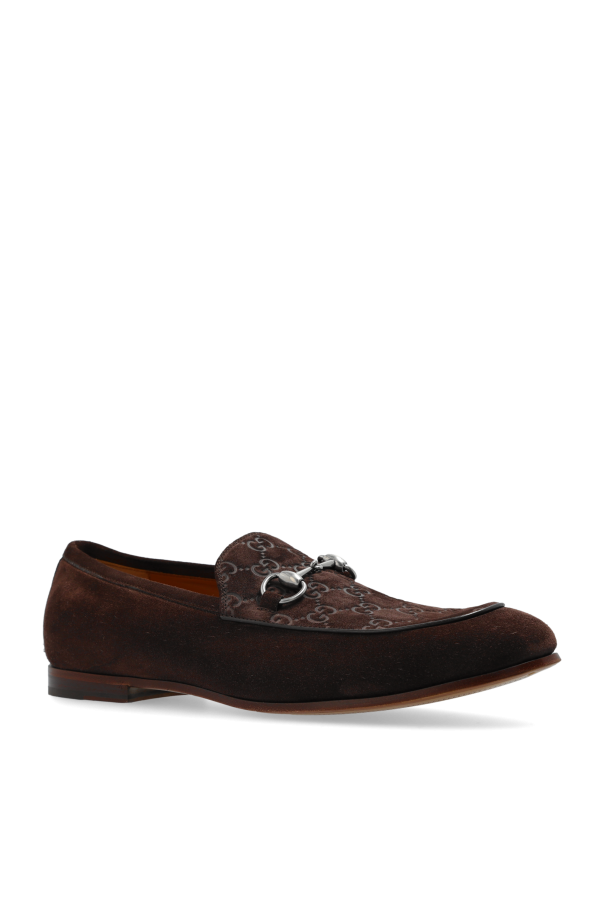 Introducing our exquisite suede loafers from an exclusive collection by the renowned fashion house, Gucci. These loafers exude sophistication and timeless elegance, making them an essential addition to any discerning wardrobe. Crafted from the finest quality dark brown suede, these loafers feature a classic design with a rounded toe and low heel, ensuring both style and comfort. The front of the shoe is adorned with a subtle yet distinctive pattern showcasing the brand's iconic logo, adding an element of refined prestige. Inside, the loafers are lined with premium leather, providing unparalleled comfort throughout the day. A signature metal buckle graces the front, a hallmark of Gucci's attention to detail and commitment to luxury. The embossed logo inside further affirms the authenticity of this exclusive footwear. Why Choose These Loafers? Classic shape with a refined, rounded toe High-quality dark brown suede for a luxurious look Comfortable leather lining for all-day wear Distinctive brand logo pattern and metal buckle Perfect for elevating elegant ensembles
