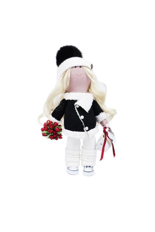 Интерьерная текстильная кукла ручной работы одета в стильную шапочку с меховым