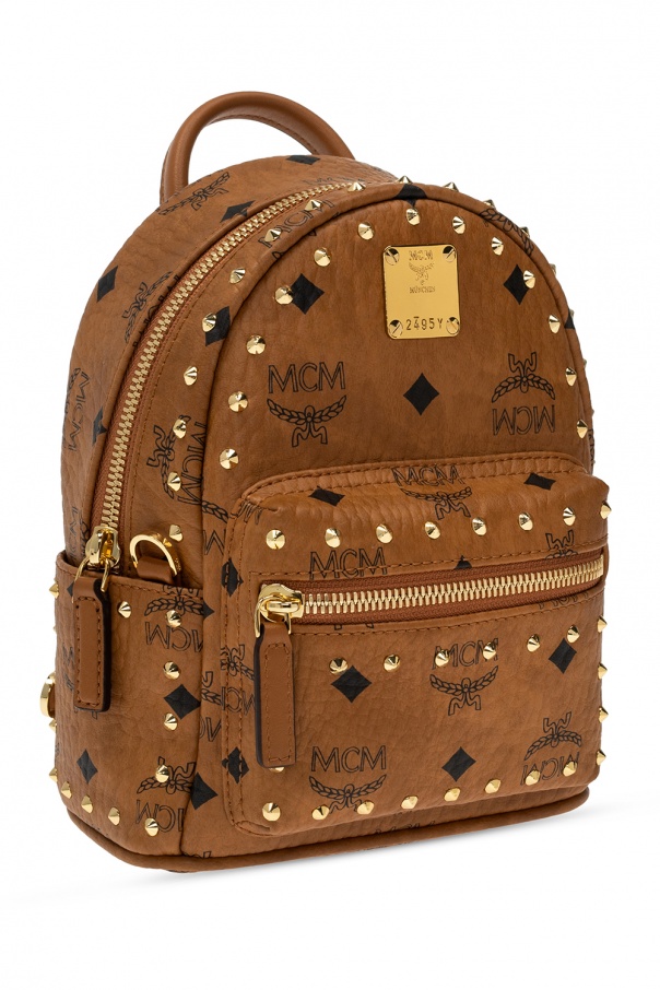 Brown backpack from MCM. Crafted from canvas, this item is enhanced by a black monogram print, distinctive details and gold-tone hardware with the label's logo. It also features zip fastening, zip pocket on the front, two slip pockets on the sides, a half-round top handle, detachable and adjustable shoulder straps and interior with one compartment and two card slots.
