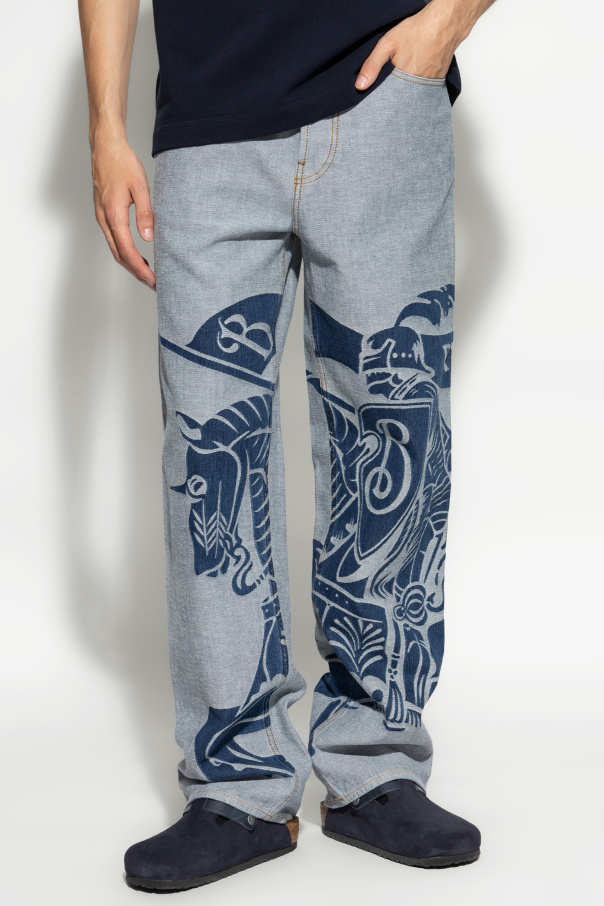 Introducing a masterpiece from the iconic Burberry collection, these logo jeans emerge as a pinnacle of sartorial elegance and innovative design. Crafted with the utmost care from 100% premium cotton denim, these jeans offer a harmonious blend of comfort and durability, ensuring they stand as a staple in any distinguished wardrobe. The jeans feature a traditional cut with slightly tapered legs, presenting a silhouette that is both timeless and flattering. What sets these jeans apart is the exquisite embellishment of plant motifs and abstract shapes, interwoven with the Burberry logo and signature inscriptions. This unique pattern, especially pronounced along the legs, serves not only as a testament to the brand's creative vision but also as a bold statement of individuality. Rendered in a palette of blue hues, from light to dark, the jeans are accentuated with subtle details such as contrast stitching and meticulously crafted button and zipper closures. While not visible in the initial portrayal, these elements hint at the meticulous attention to detail that defines Burberry’s legacy. Why Purchase These Logo Jeans? Exclusive Design: Stand out with a unique pattern that blends artistic flair with the Burberry heritage. Premium Quality Material: Enjoy the unparalleled comfort and longevity provided by high-quality denim. Versatile Styling: Easily pair with both casual and formal ensembles for a look that transitions seamlessly from day to night. Functional Features: Benefit from practical elements such as five pocket styling for convenience and utility.