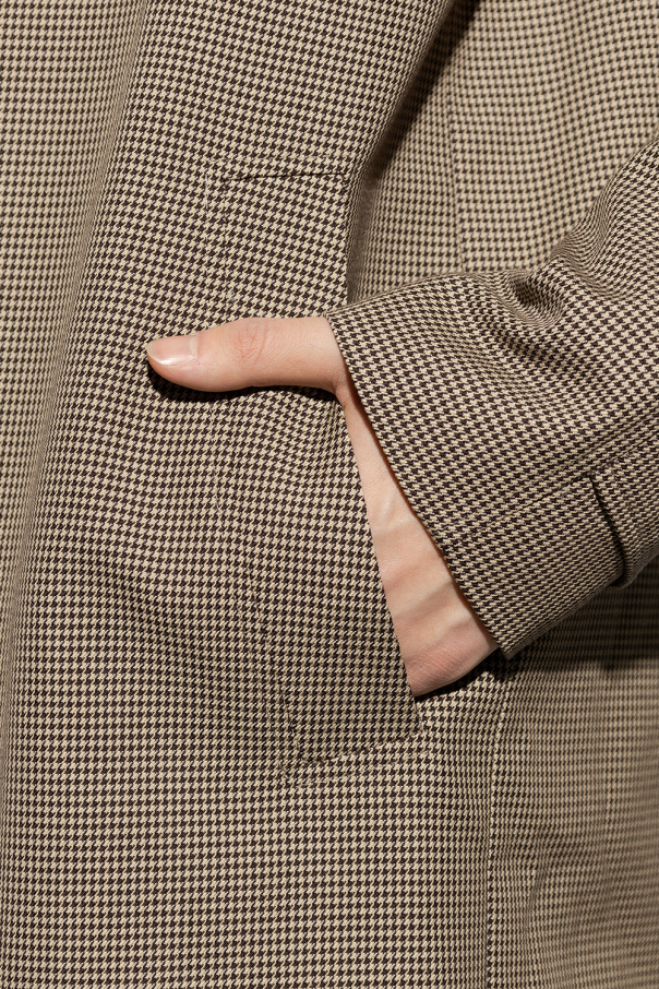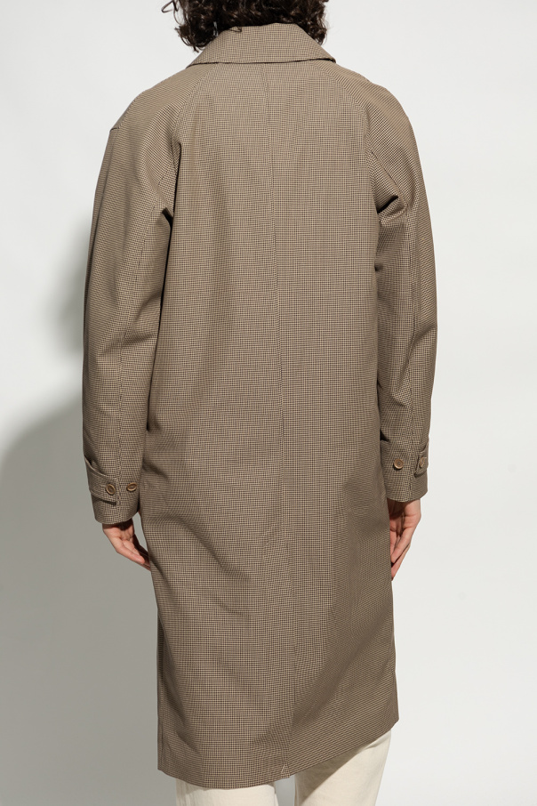Beige and brown ‘Jacob X’ coat from Samsoe Samsoe. Crafted from a blend of cotton and recycled material with a long fit, this style showcases a houndstooth pattern, button fastenings with a concealed placket, two slip pockets, a single back vent and long sleeves