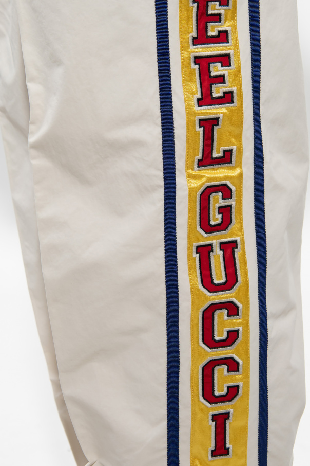 Cream sweatpants from Gucci. This pair has an elastic drawstring waistband, four slip pockets and long legs with yellow and navy side stripes, red logo motif and elasticated cuffs.