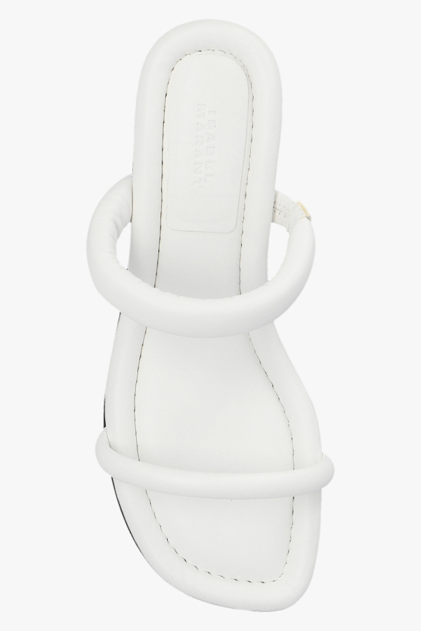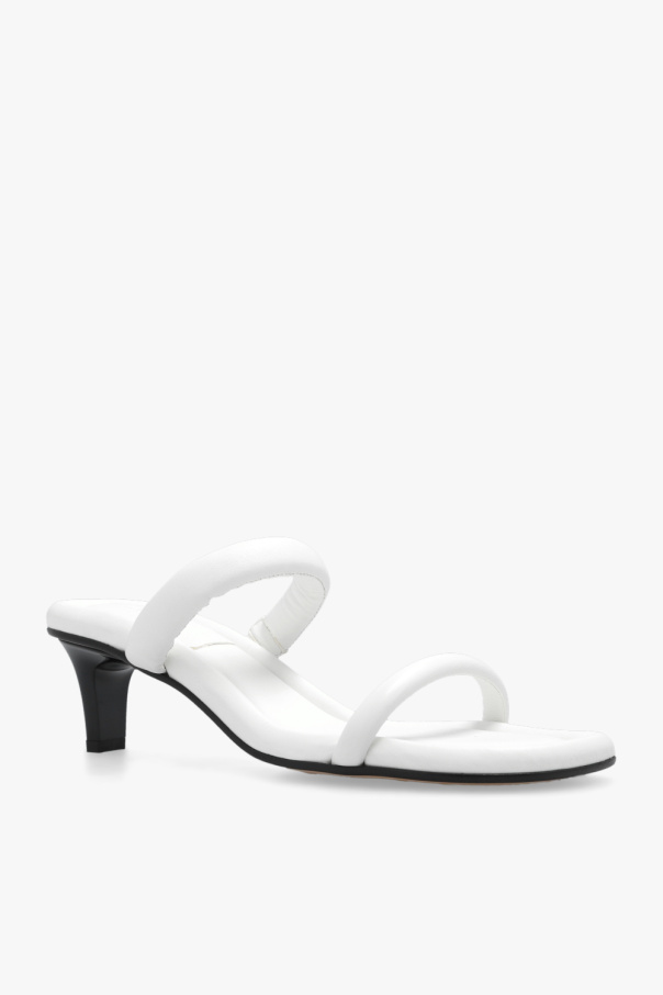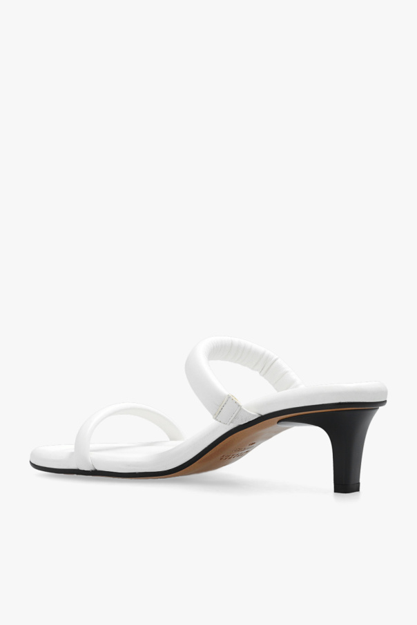 White ‘Raree’ mules from Isabel Marant. Made of leather, this model sits on a brown leather sole and features a contrasting black heel.