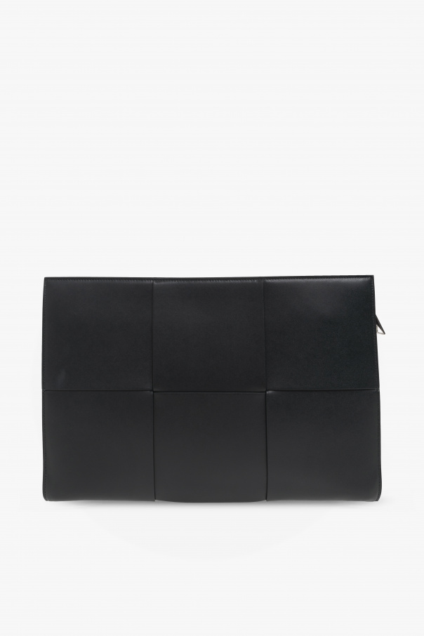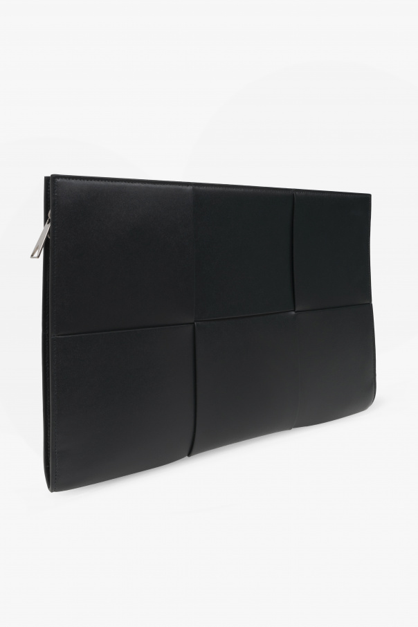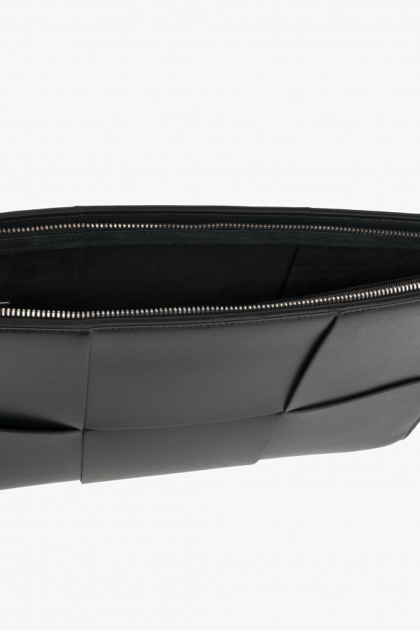Dark green ‘Arco Medium’ leather briefcase from Bottega Veneta. Crafted from calf leather accentuated with the brand's iconic Intreccio weave, this design features a two-way zip fastening, silver-tone metal hardware and a suede-clad interior with a zip pocket.