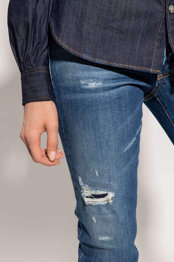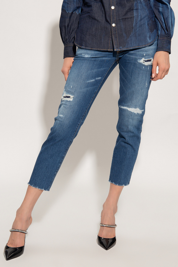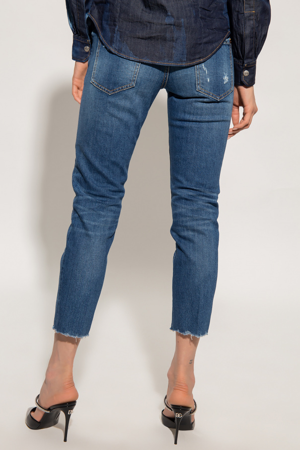 Dark blue ‘Jennifer Cropped’ distressed jeans from Dsquared2, the ‘One Life One Planet’ capsule collection. Made of organic cotton with the GOTS certificate, this pair falls down with slightly tapered, cropped legs and is complete with button fastenings, green logo patches, stitching details, five slip pockets and raw cut edges.