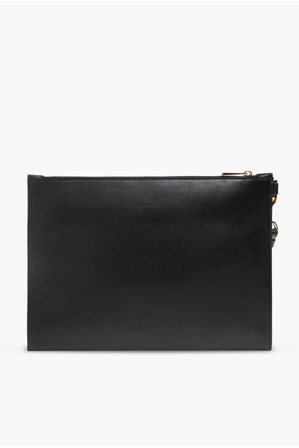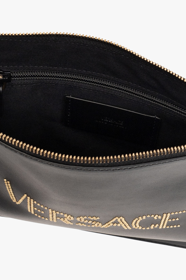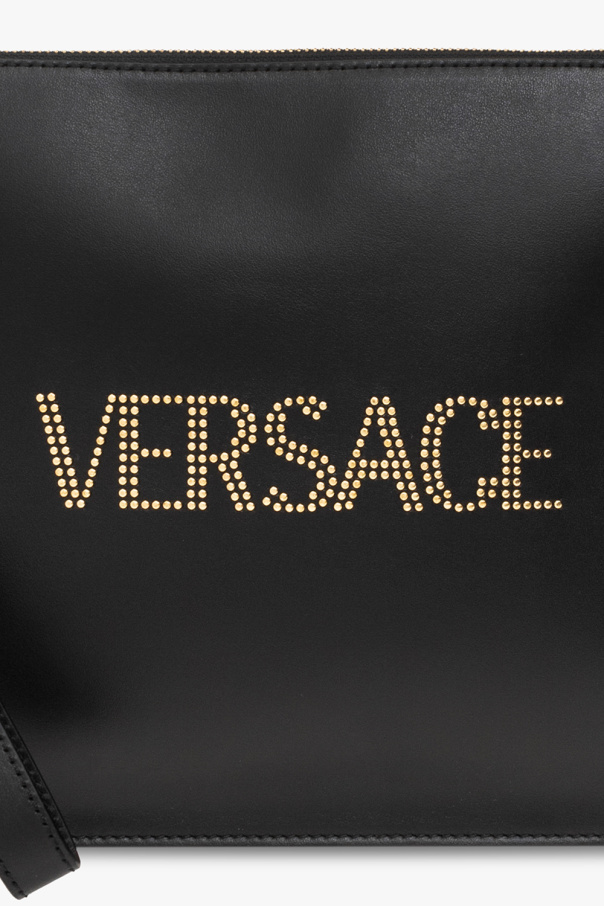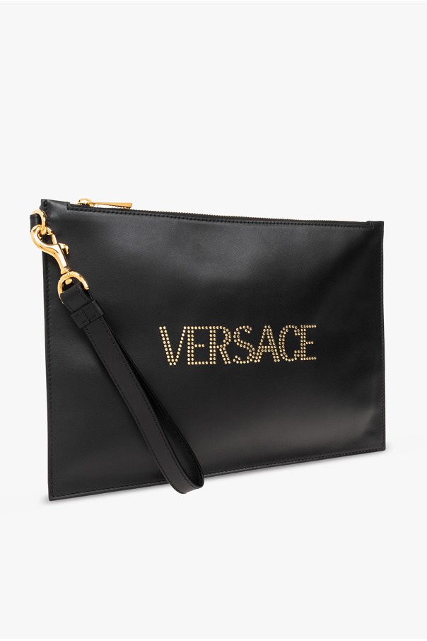 Black holdall bag from Versace. Made of leather, this model features a zip fastening, gold-tone logo appliqués, wrist strap, gold-tone metal hardware and one internal compartment with one zip pocket.
