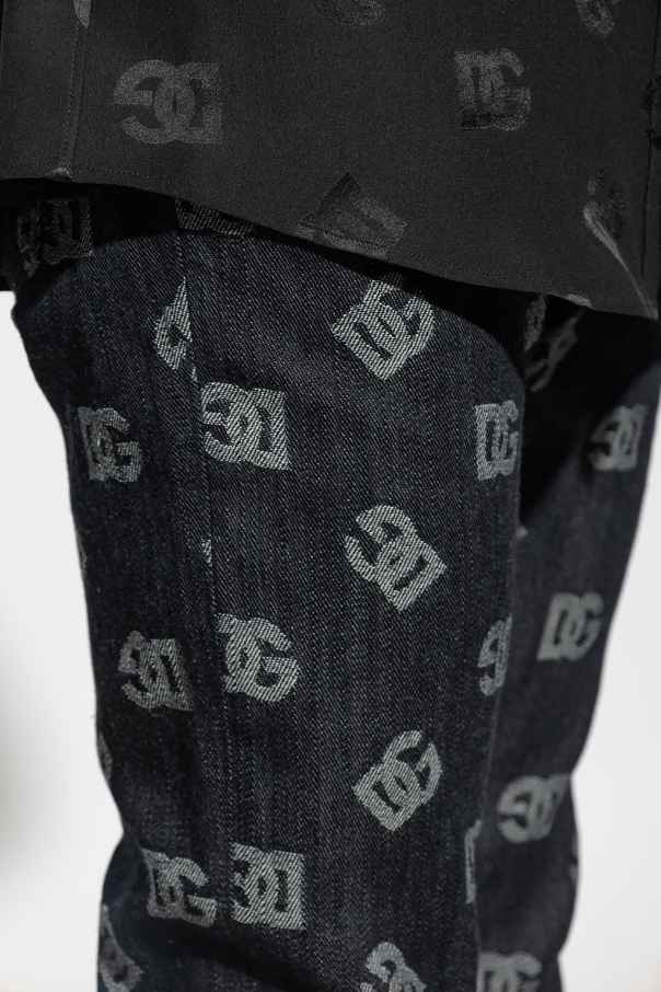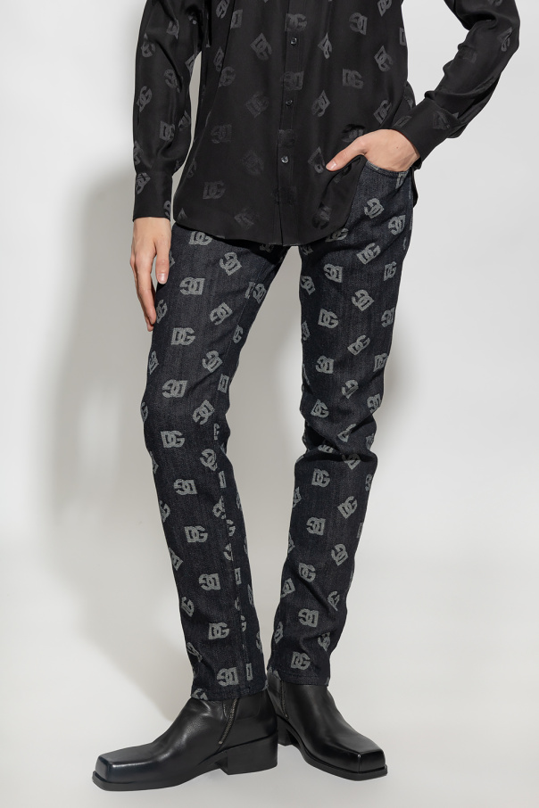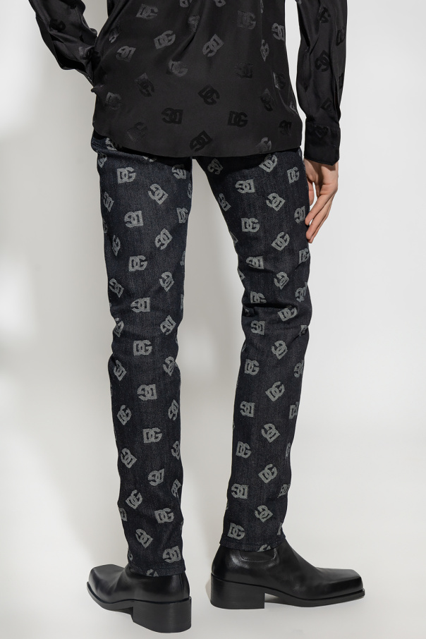 Navy skinny fit jeans from Dolce & Gabbana. Fastened with a zip and button, this tapered leg design features an embroidered monogram pattern, logo patches, three front pockets and two back pockets.