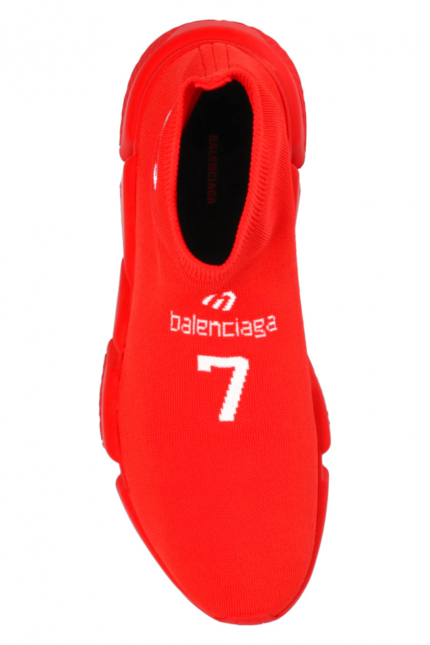 Red ‘Speed LT Soccer’ sneakers from Balenciaga. Boasting a high-top silhouette with a technical knit sock, this pair sits on a red rubber sole and showcases white logo embroidery.
