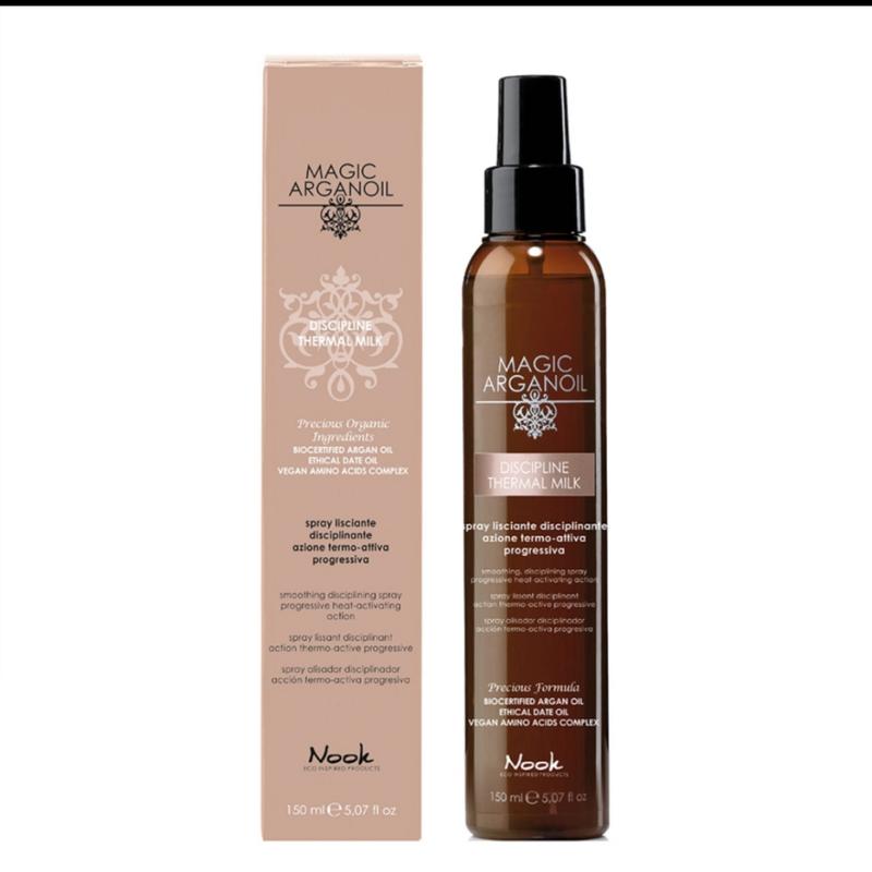Разглаживающий, дисциплинирующий спрей с термоактивным действием. Обогащен органическим аргановым маслом, финиковым маслом и растительным комплексом аминокислот. Благодаря особой формуле, обогащенной комплексом растительных активных ингредиентов с мощными регенерирующими свойствами, и эффективному термоактивному действию, молочко-спрей защищает волосы от механического и термического стресса, сокращает время укладки и помогает предотвратить любые повреждения структуры волос.