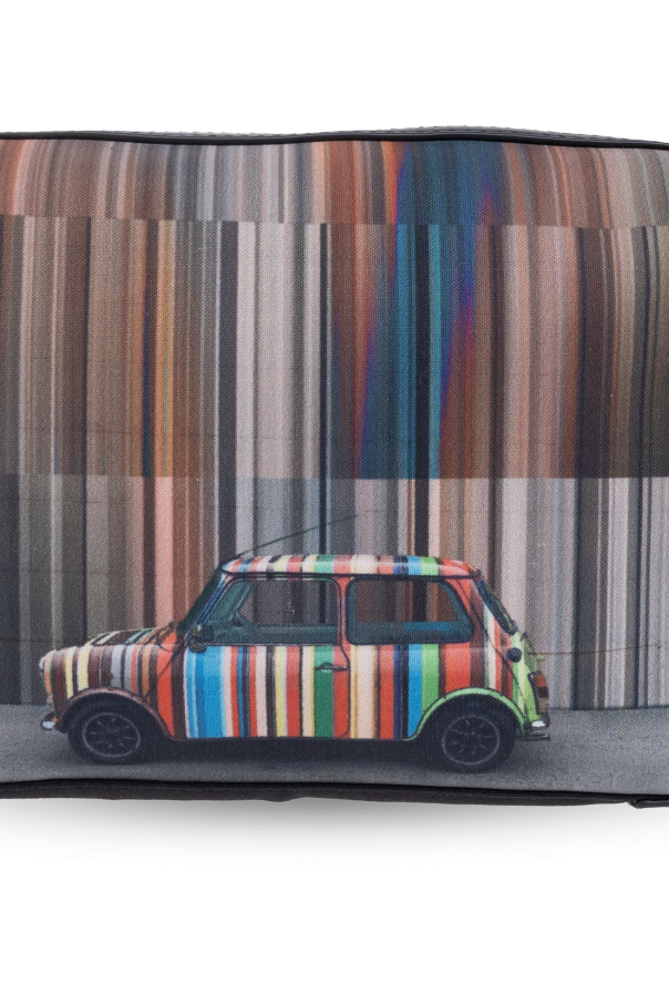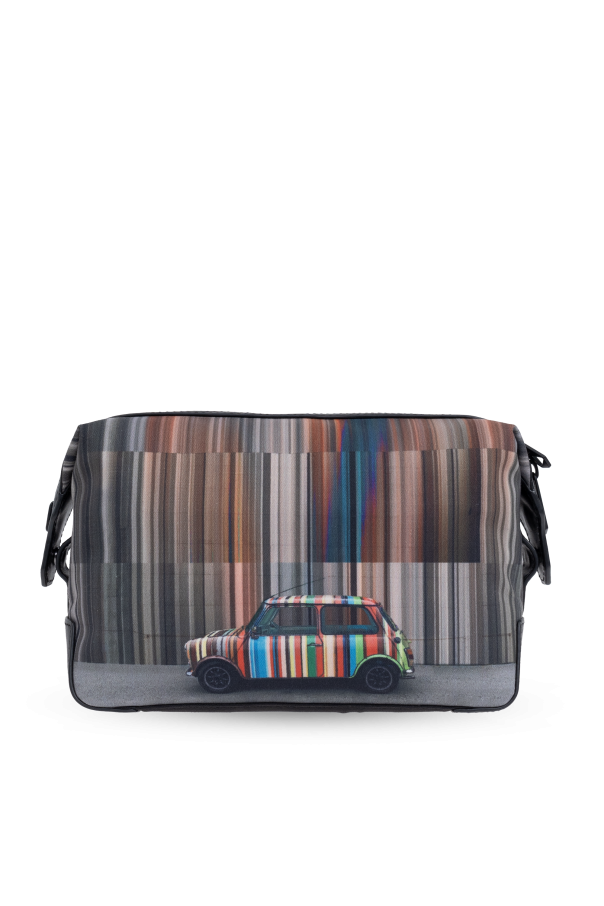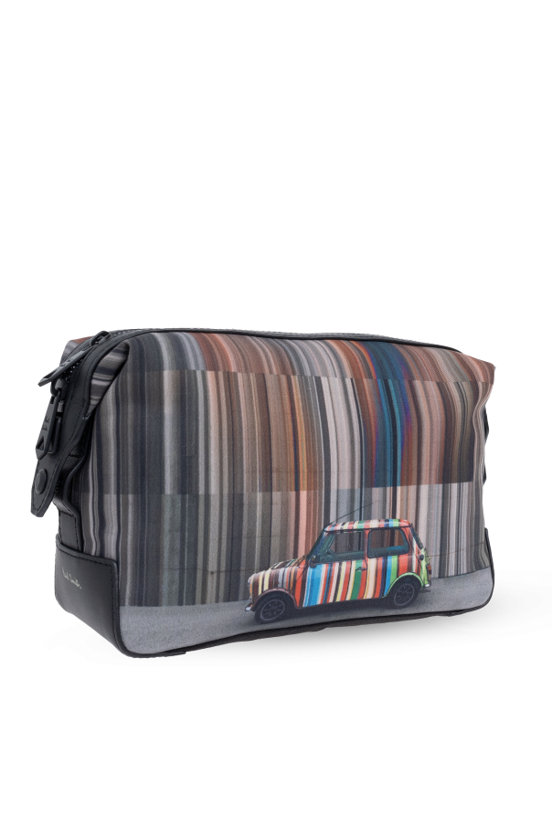 Introducing a unique masterpiece from the renowned designer, Paul Smith, this toiletry bag showcases a harmonious blend of sophistication and functionality. Encased in a durable fabric composed of leather and recycled polyester, it is not only a testament to eco-conscious craftsmanship but also to enduring elegance. The striking feature of this piece is its multicolored striped pattern, interspersed with a distinctive print of a classic car silhouette, set against a contrasting background that adds a touch of whimsy and character. The meticulously chosen palette of greys, browns, blues, and reds, although precise shades may vary, provides a versatile yet vibrant aesthetic that can complement any travel or daily grooming essentials. Designed for both versatility and protection, the toiletry bag is accented with dark, possibly reinforced material at its base and sides, safeguarding against wear and stains. Its rectangular shape, with gently rounded edges, and a black zipper closure, ensures ease of access to the main compartment, which houses an additional three pockets for organized storage. Side handles offer convenient carrying or hanging options, underscoring the practicality of this accessory. The absence of external branding elements speaks to Paul Smith’s minimalist approach, allowing the design itself to captivate and speak volumes. Why Purchase This Product? Durable and sustainable materials: Leather and recycled polyester Exceptional design with a unique car print and vibrant stripe pattern Practical functionality: Easy-access main compartment with three internal pockets Versatile use with convenient side handles Minimalist branding enhances the elegant design