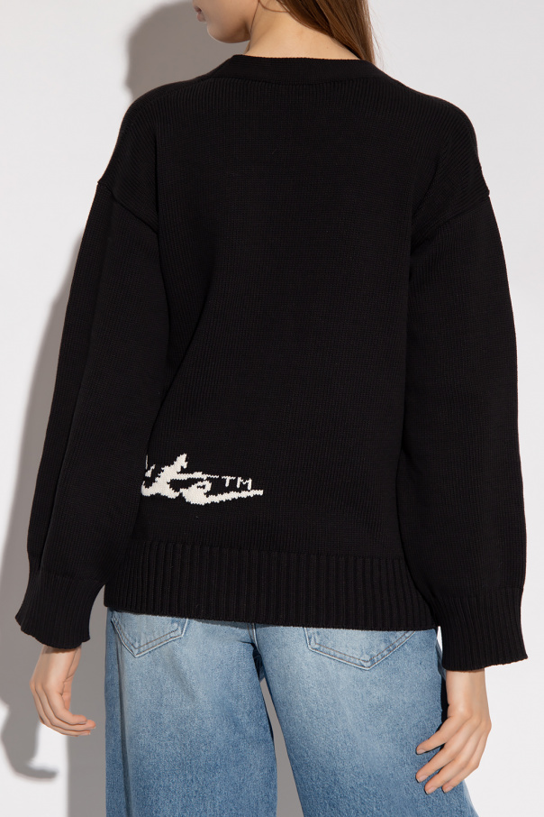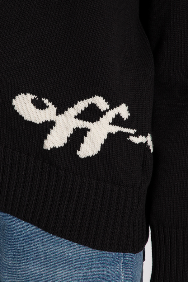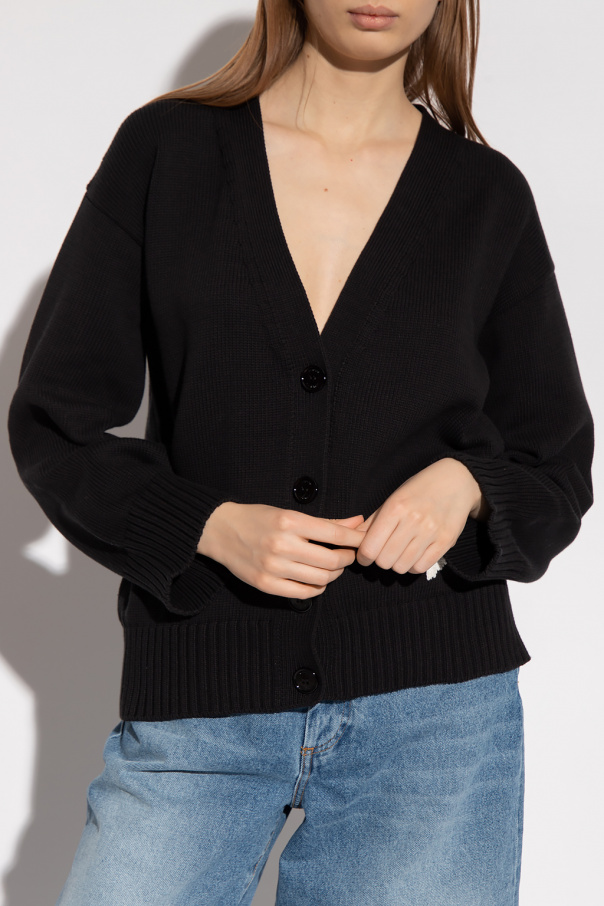 Black cardigan from Off-White. Fastened with buttons, this V-neck design features a white logo embroidery and ribbed trims at the neck, hem and cuffs.