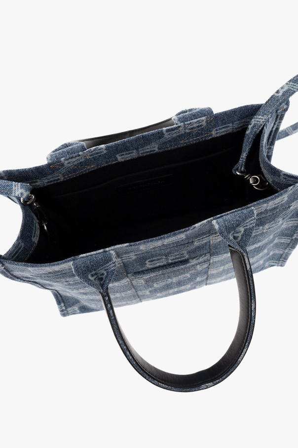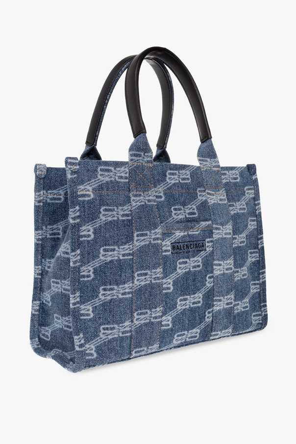 Blue ‘Hardware S’ shopper bag from Balenciaga. Made of fabric, this model is complete with a monogram pattern, two half-round handles, shoulder strap, silver-tone metal hardware and one internal compartment with one slip pocket and one zip pocket.
