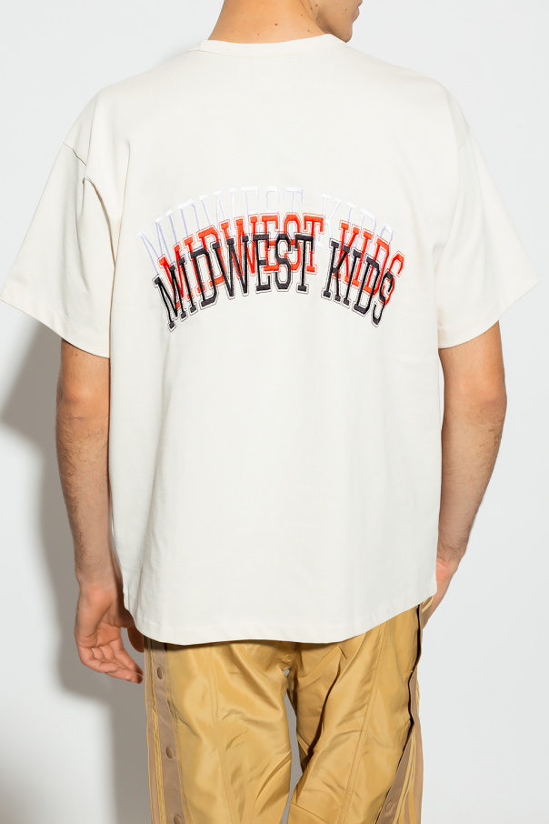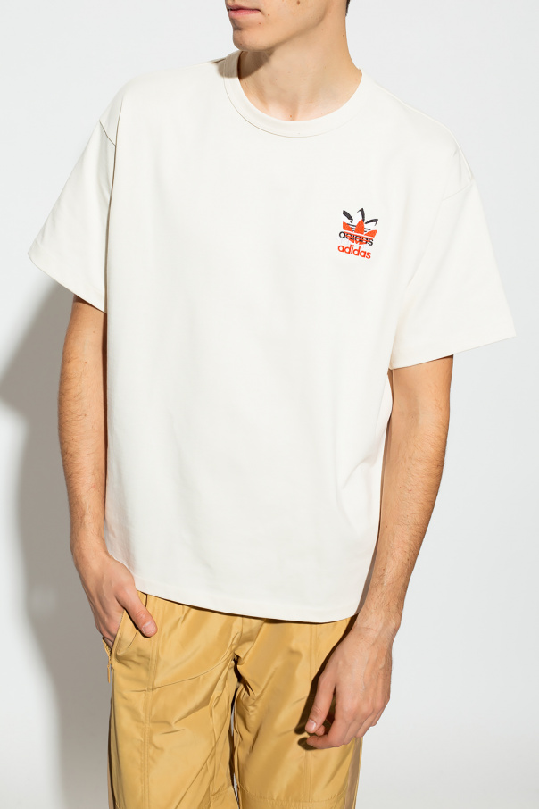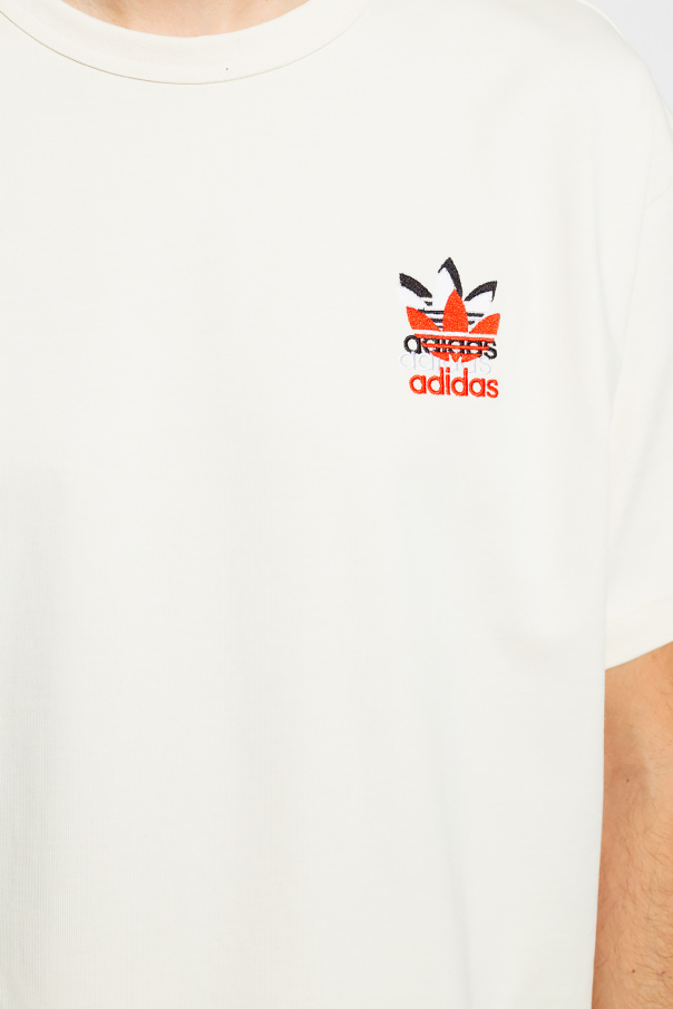 Cream T-shirt from ADIDAS Originals x Midwest Kids. Made of cotton, this style features short sleeves, an elasticated collar and black, white and red graphic embroidery with the brand's logo.