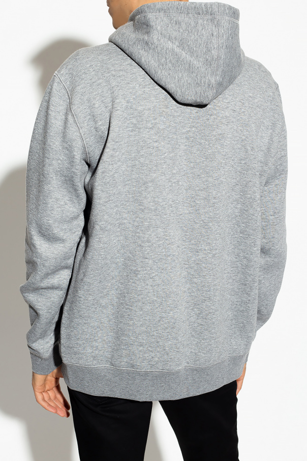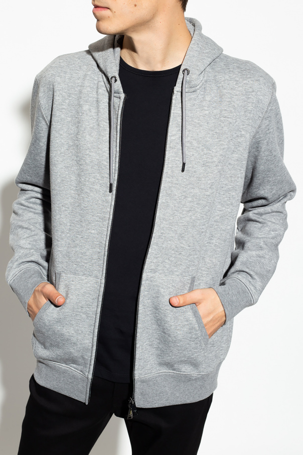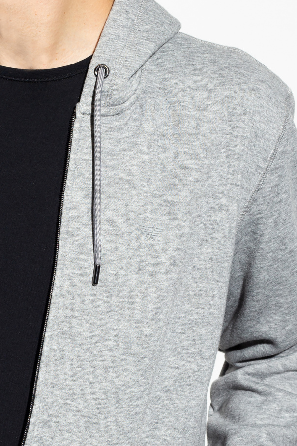 Grey sweatshirt from Emporio Armani. Fastened with a zipper. Hood pulled with straps. On the front two inset pockets and a printed, grey logo. Bottom and sleeves finished with welts.