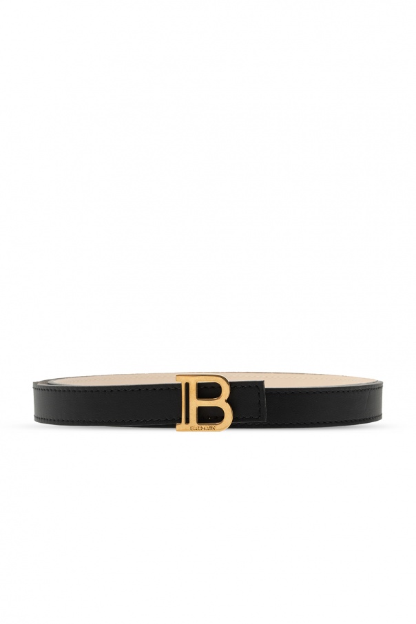 Black belt from Balmain. Crafted from calf leather, this accessory fastens via gold-tone buckle shaped like logo.