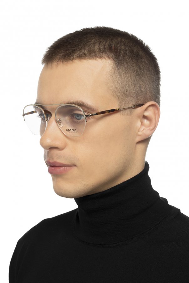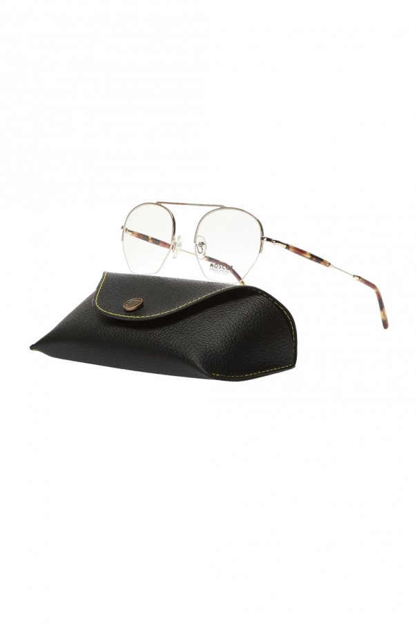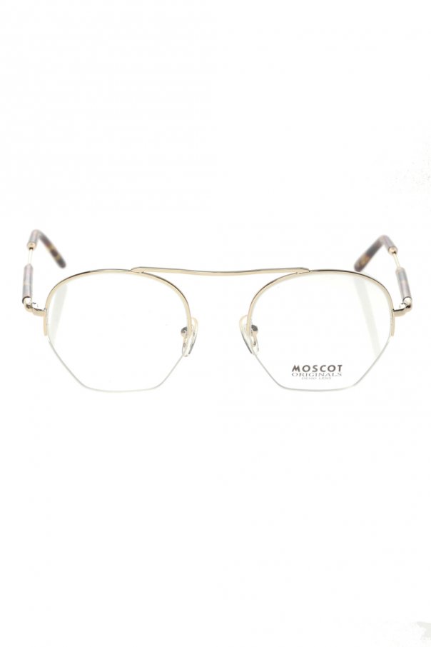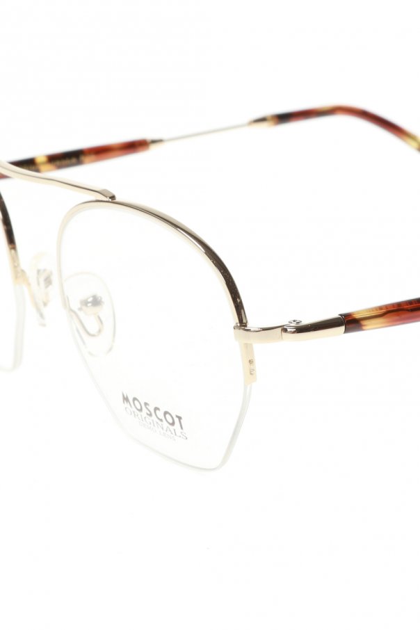 Gold-tone ‘Punim’ optical glasses from Moscot. High bridge. Brown temples featuring a printed pattern in beige. Handmade frames.