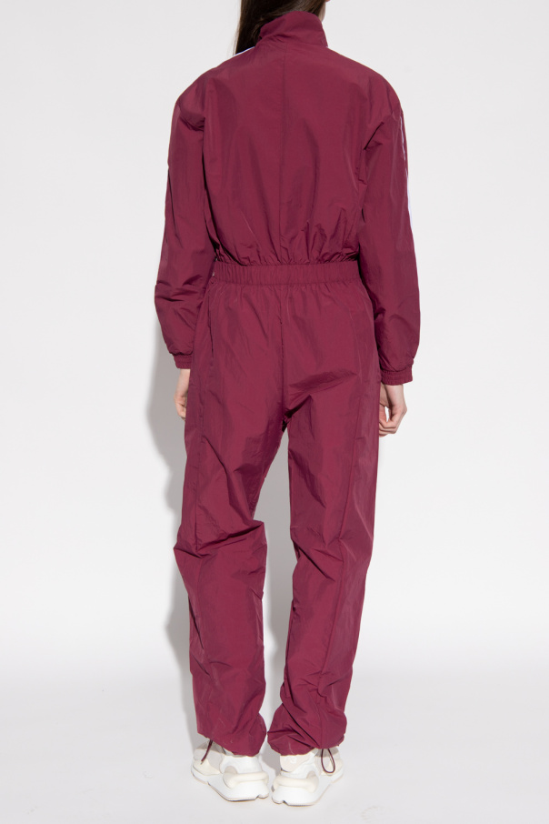 Maroon jumpsuit from ADIDAS Originals. Accentuated with the brand's signature three stripes on the sleeves, this style features a zip fastening accompanied by white logo embroidery on the front, an elastic waist an cuffs and straight legs with drawstring hems.