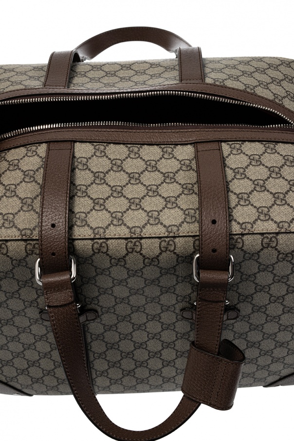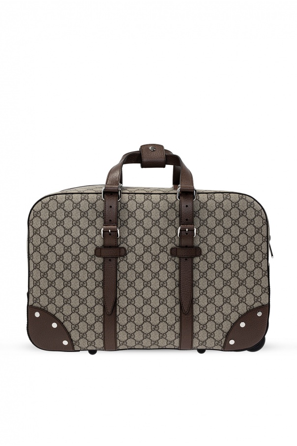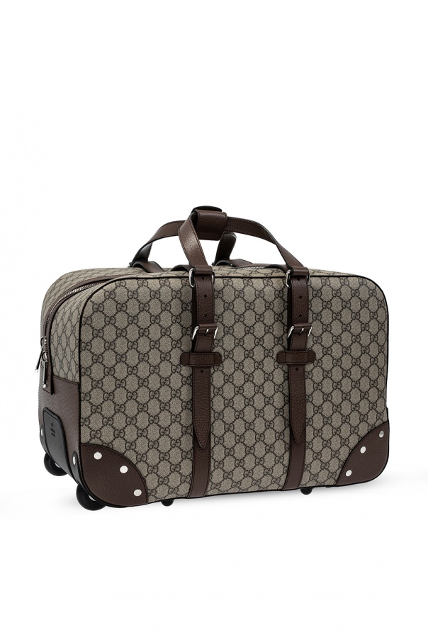 Beige and brown suitcase on wheels from Gucci. Crafted from GG Supreme canvas with leather trims, this item is complete with a two-way zip, two adjustable half-round handles, a telescopic handle, silver-tone metal hardware and one internal compartment with one zip pocket and two slip pockets.