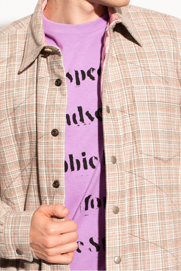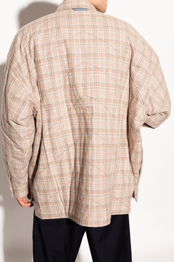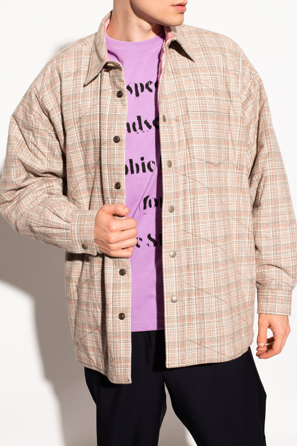 Cream, red and green jacket from Acne Studios. Crafted from cotton with an all-over check pattern, this style features snap fastenings and long sleeves.