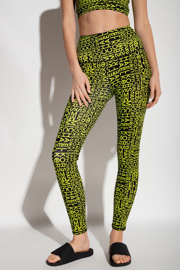 Black and neon green sports leggings from Michael Michael Kors. Crafted from recycled material, they feature a logo theme, two side slip pockets and one back pocket with a hidden zip.